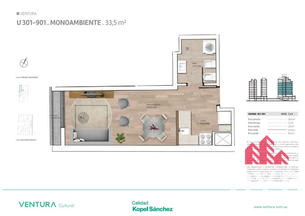 La propiedad, con solo 3 años de antigüedad, presenta terminaciones de alta calidad y un nivel de seguridad sobresaliente, incluyendo reja y cerca eléctrica. Además, cuenta con servicios de portería y control de acceso que garantizan la tranquilidad de sus residentes. Los bajos costos de gastos comunes, que ascienden a UY$3.500, hacen de este apartamento una opción aún más atractiva. Con una distribución funcional que incluye un baño, cocina, balcón y un living comedor, este inmueble tiene todo lo necesario para disfrutar de una vida cómoda y práctica. La orientación norte proporciona luminosidad natural, creando un ambiente cálido y acogedor.