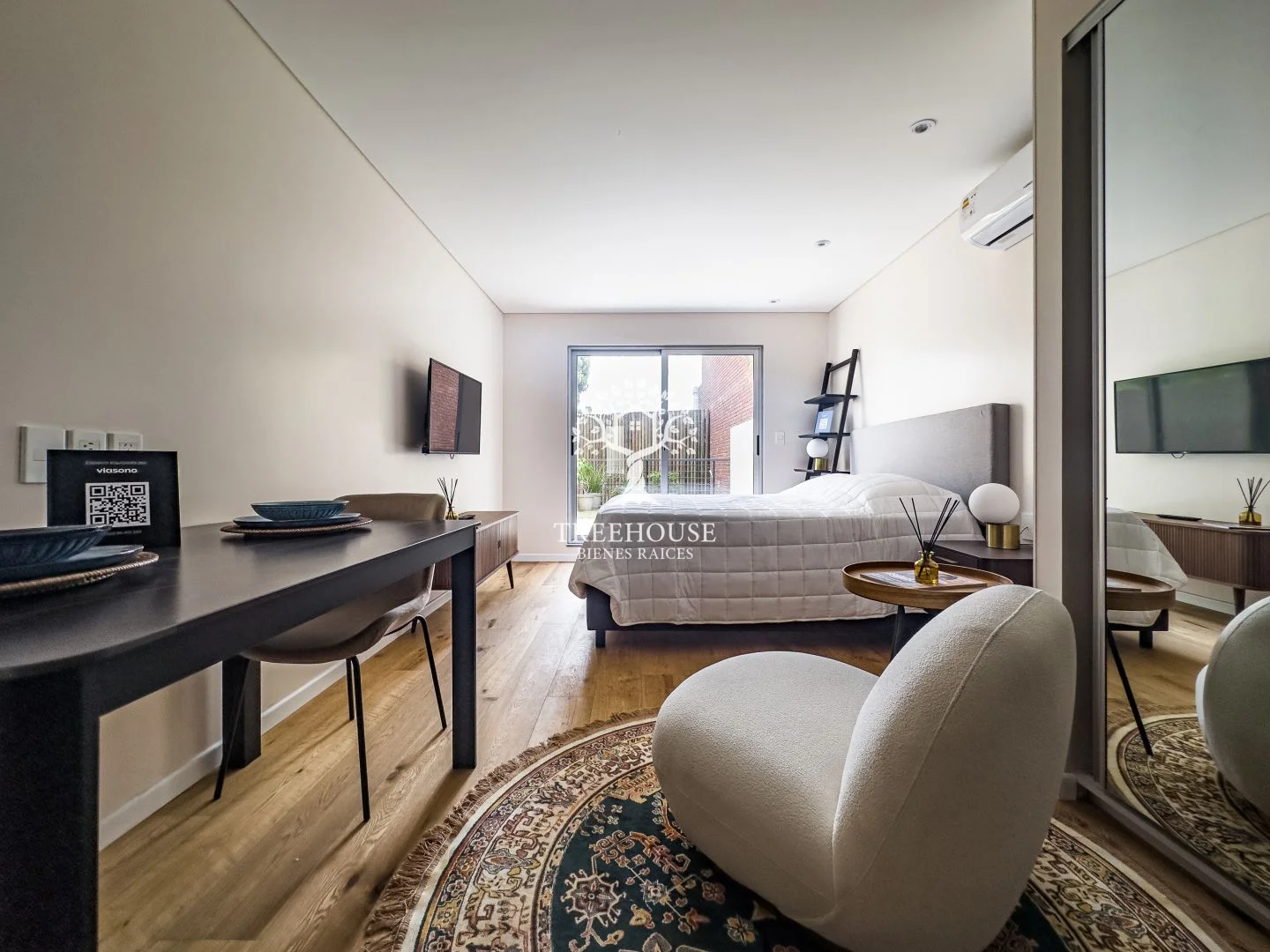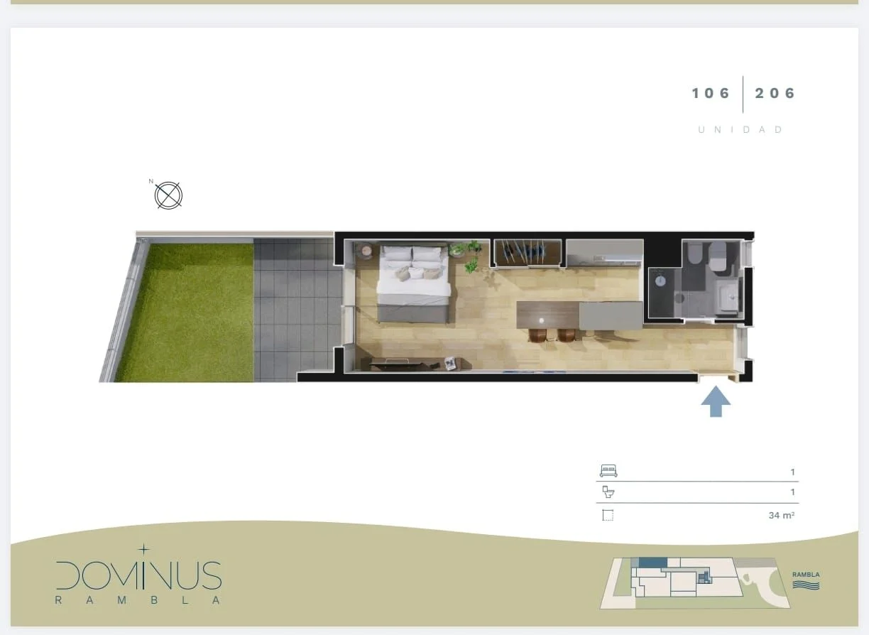 TreeHouse Bienes Raíces Alquila! Apartamento Monoambiente con Garaje en Carrasco, Montevideo. A estrenar! Ubicación: Frente a la Rambla de Carrasco, Dominus Rambla ofrece la calma de un entorno natural junto con amplias vistas al mar. A corta distancia, cuenta con una variada oferta gastronómica, áreas comerciales en Av. Bolivia y Arocena, y diversas alternativas de entretenimiento, logrando una combinación equilibrada entre tranquilidad, servicios y buena conectividad. Apartamento ubicado en segundo piso, al contrafrente. Cuenta con un ambiente único con cocina integrada, baño completo y salida a terraza con jardín de uso exclusivo. La unidad se destaca por su diseño funcional, con buena distribución del espacio y una excelente conexión con el exterior, ideal para quienes buscan comodidad y disfrute de un espacio verde propio. Los apartamentos cuentan con cocina equipada (anafe, horno y campana), aire acondicionado en los ambientes y placares. Metros internos: 34 m² + 18,1 m² de terraza. Amenities: Piscina y parrillero con vista a la Rambla. Imágenes corresponden a apartamento modelo. Comercializa: Marina Porcile (+598 ***) Asociada a TreeHouse Bienes Raíces . Caracteristicas: CONEXION PARA LAVARROPAS XINTEL (TBR-TBR-5540)