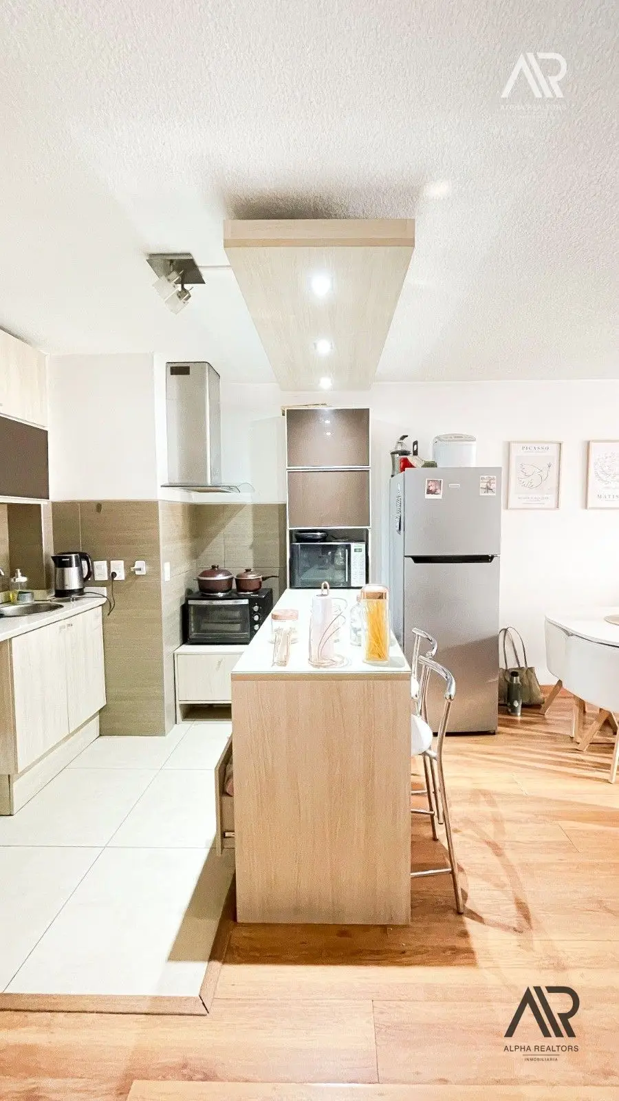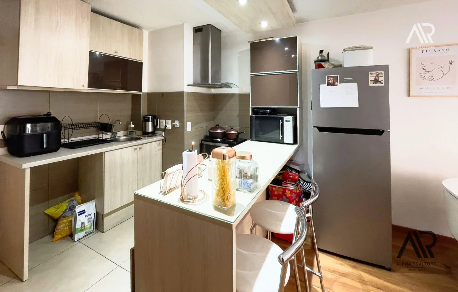 -  Cocina integrada, muy cómoda y funcional, con muchos placares sobre y bajo mesada de excelente calidad, barra desayunadora muy amplia, campana extractora y muy buenas luminarias.