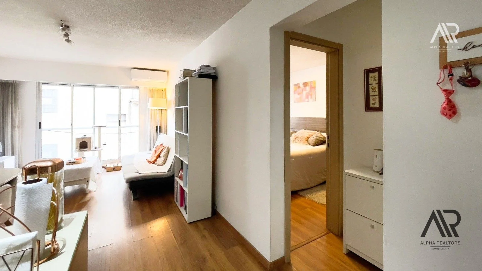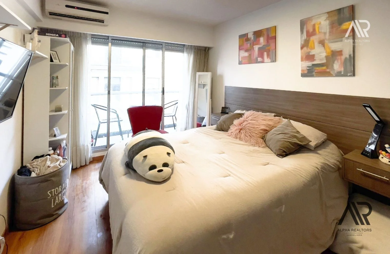 - 1 dormitorio amplio y muy iluminado, con acceso directo a una terraza privada, con  buen placard y aire acondicionado.