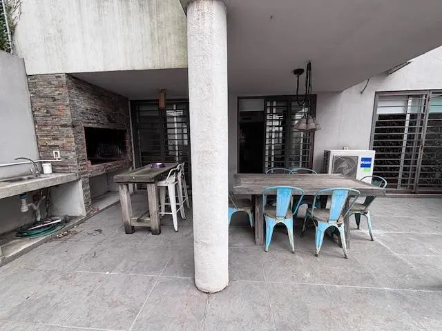 Living con estufa a leña, y ventanales piso a techo con salida a un patio semi techado, con parrillero, mesa de comedor y barra de madera rústica, y una mesada de material. con bacha, lindera al parrillero.