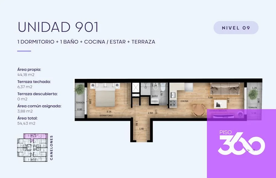 El apartamento cuenta con 1 dormitorio, 1 baño completo, una cocina integrada y un amplio estar-comedor luminoso que se conecta con una terraza techada, ideal para disfrutar de vistas abiertas. Con una superficie total de 50,51 m² (41,34 m² propios + 5,54 m² de terraza techada + 3,63 m² de áreas comunes), cada rincón ha sido diseñado para maximizar el confort y la funcionalidad, permitiendo una experiencia de vida excepcional.