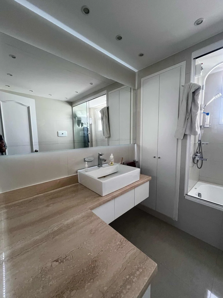 El apartamento se compone de tres amplios dormitorios y tres baños, junto con una cocina funcional y un balcón ideal para disfrutar de las vistas.