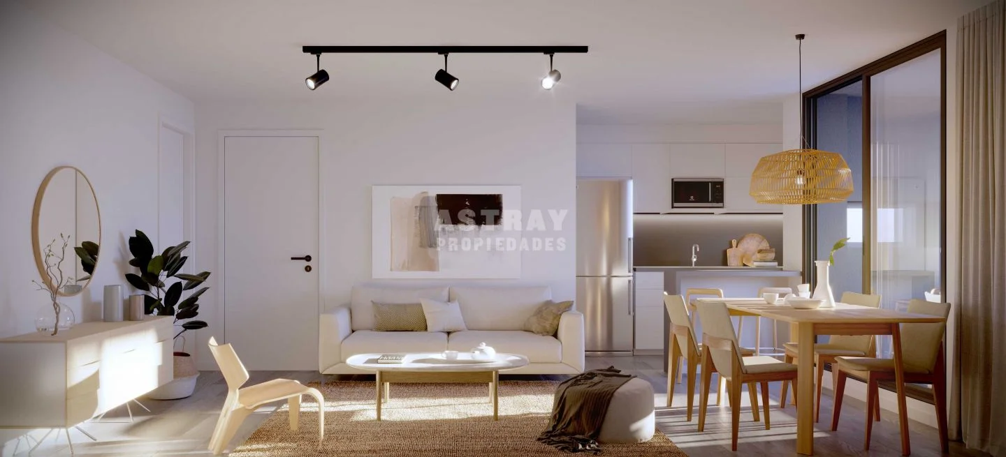 Living comedor de buenas dimensiones con cocina semi integrada y balcón al frente.