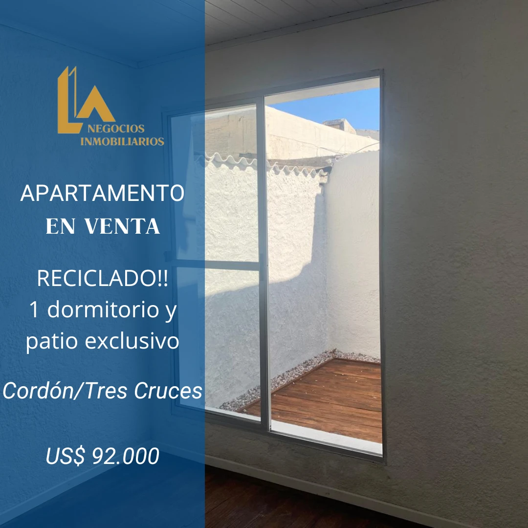 Laura Amaro Negocios Inmobiliarios vende: OPORTUNIDAD!! Ideal vivienda estudiantes o inversión!! Apartamento RECICLADO en Cordón, límite con Tres Cruces, frente a Plaza Seregni. 1 dormitorio y patio exclusivo!! 45m2 tot. 38m2 edificados + 7m2 patio. Bajos gastos comunes!! Desarrollado al contrafrente, primer piso por escalera, la unidad cuenta con: -Luminoso living-comedor con ventana; -Cocina semi-definida con muebles sobre y bajo mesada y conexión para lavarropas; -Baño completo actualizado; -1 amplio dormitorio con ventanal corredizo (de aluminio) a patio; -Acojedor patio exclusivo (7m2) con deck. TODO RECICLADO!! Baño y cocina actualizados, cañería en termofusión y eléctrica hechas a nuevo. Pisos originales de lapacho en living y dormitorio, pisos flotantes en cocina. Pasillos del edificio amplios. Excelente punto de la ciudad, frente a Plaza Seregni, a pasos de 18 de Julio, facultades, Shopping Tres Cruces y variedad de servicios, junto a muy buena locomoción departamental e interdepartamental. Ideal para estudiantes!! Gastos comunes: $2.500 aprox. Precio de venta: US$ 88.000. BENEFICIOS EXCLUSIVOS PARA NUESTROS CLIENTES!! Coordine su visita al 097522512. "Tu lugar ideal, nuestra prioridad". LOS DATOS AQUÍ EXPUESTOS SON APORTADOS POR LOS PROPIETARIOS.