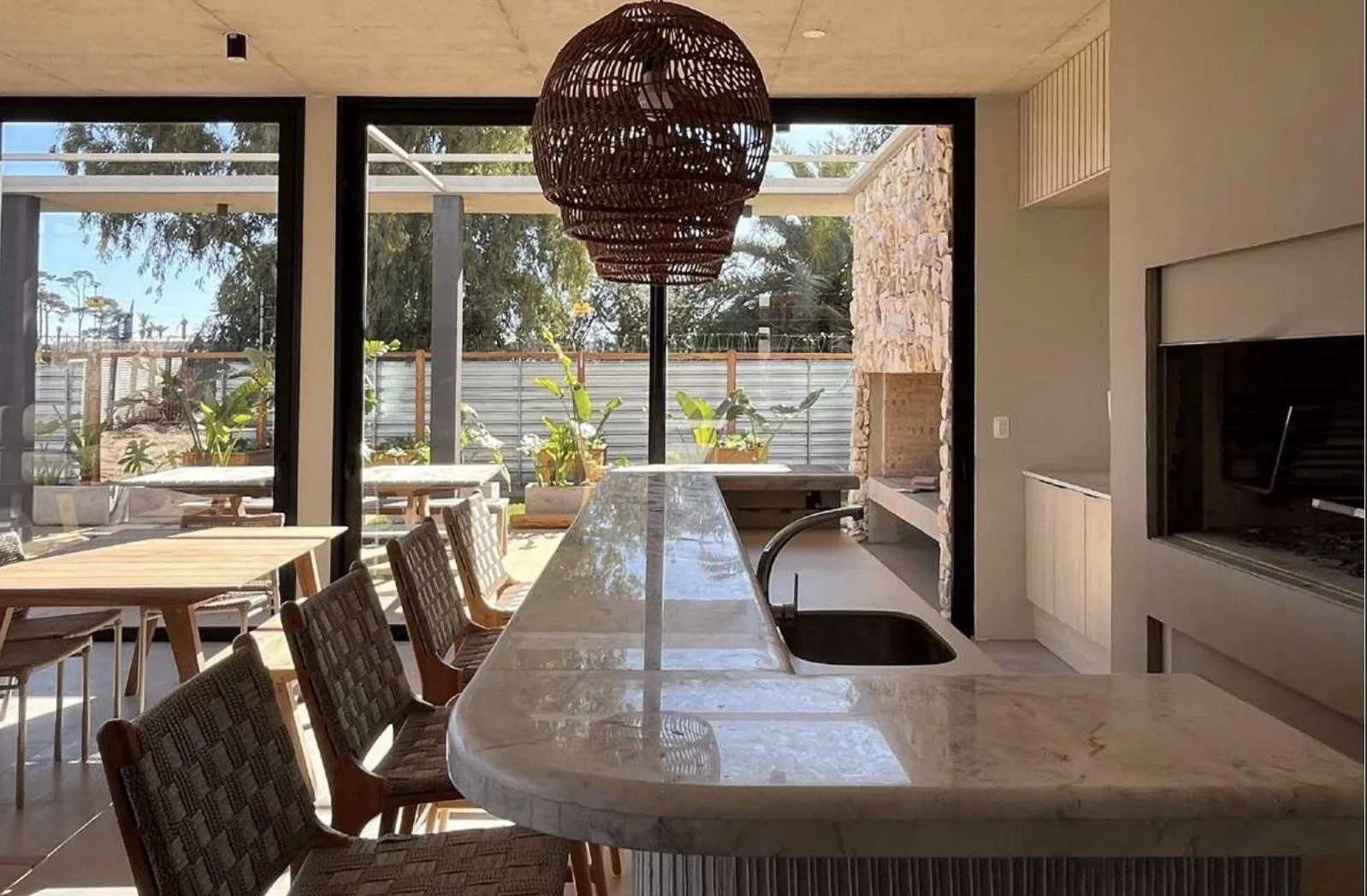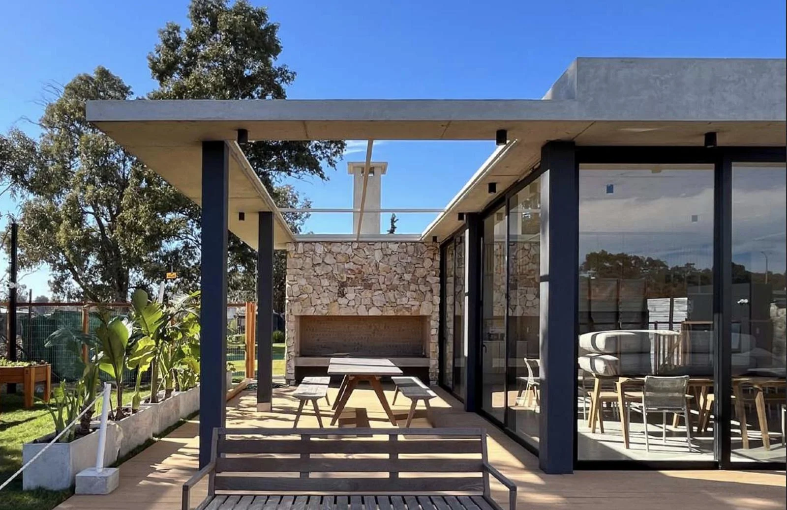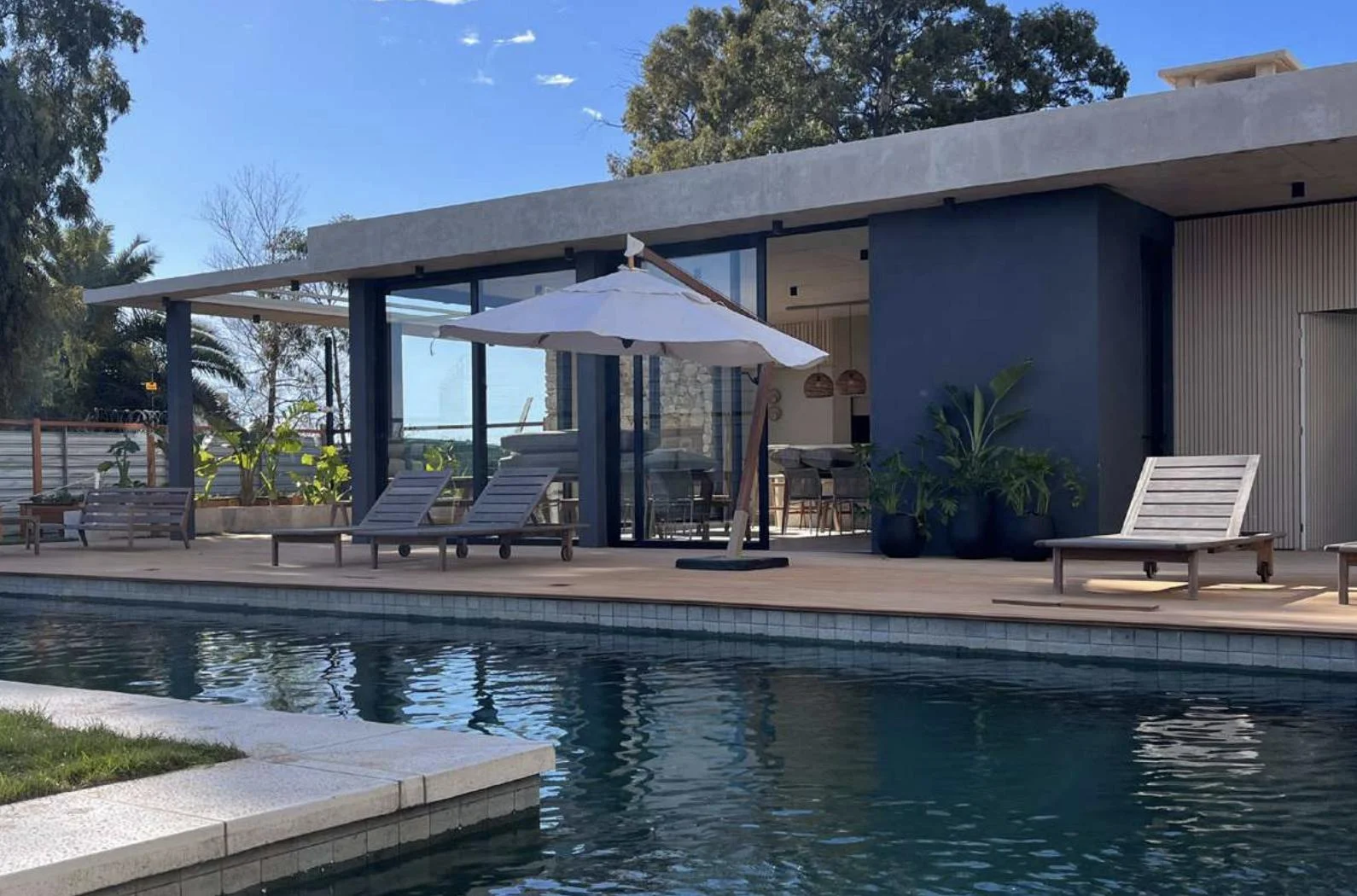 Quincho exterior con parrillero, piscina y solarium