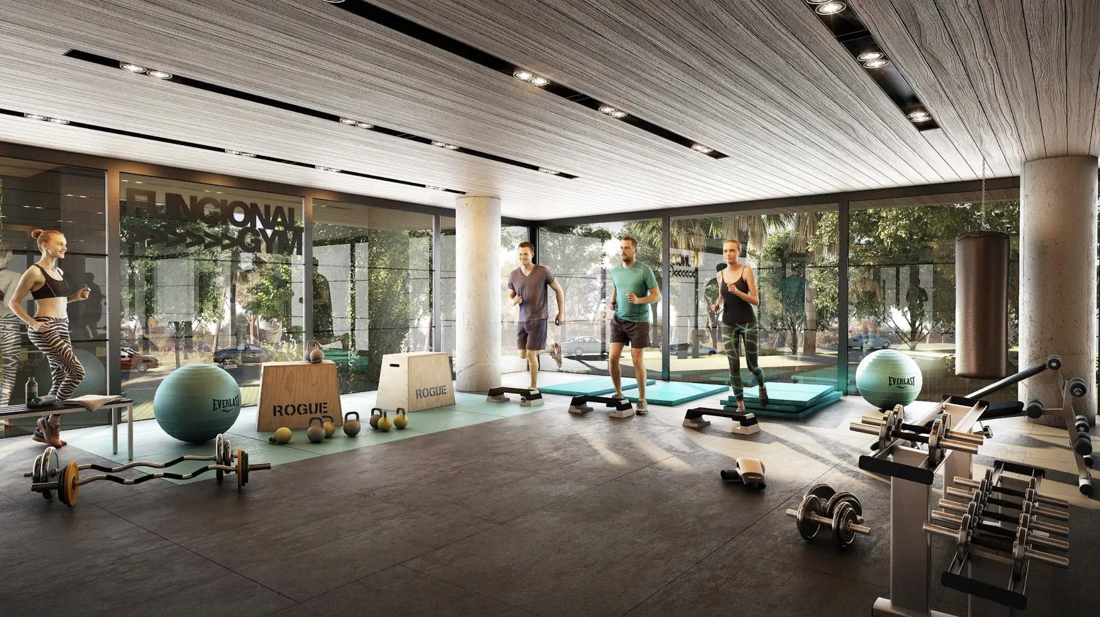 Gimnasio con equipos y espacio para desarrollar actividades deportivas.