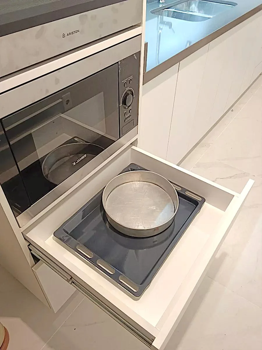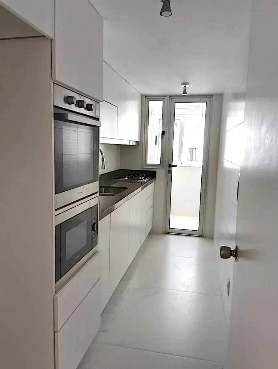 Cocina con placares bajo y sobre mesada, anafe a supergas, horno y microondas empotrado, campana telescópica.