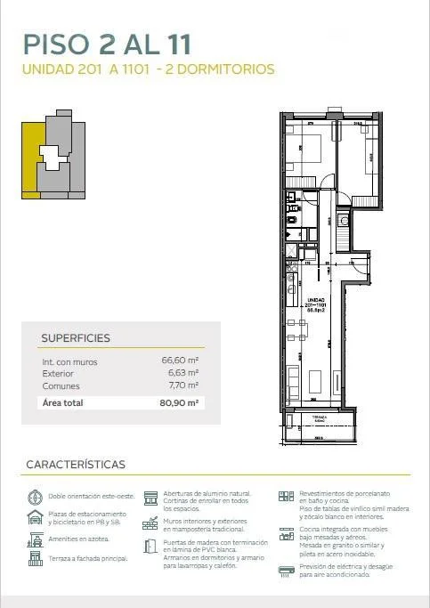 El edificio cuenta con 12 pisos en total y 43 unidades de uno y dos dormitorios. Todos con excelente orientación y terrazas abiertas con muy buenas vistas despejadas.