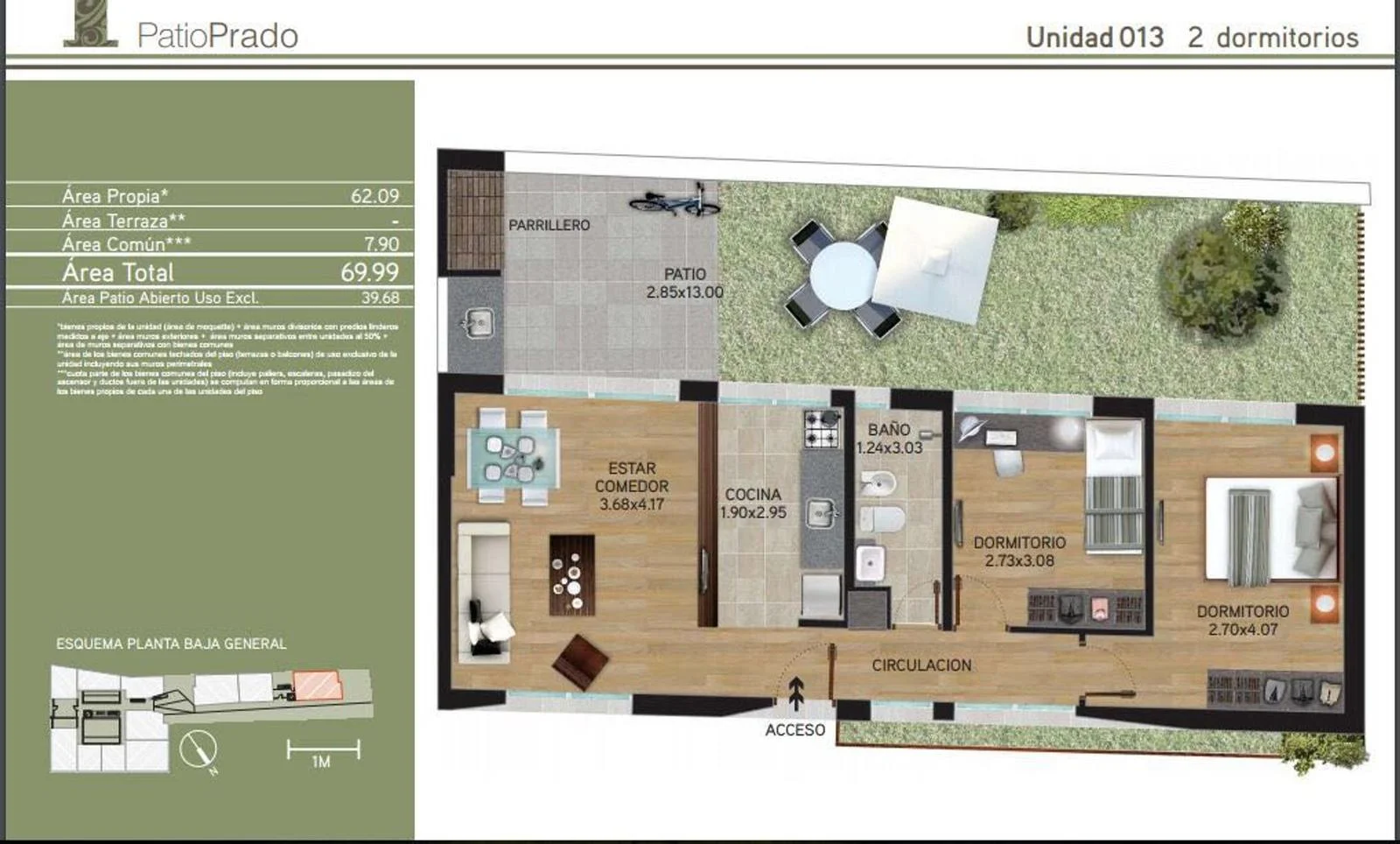 Dispone de 62 m² de área propia interior, a los que se suman 40 m² de patio de uso exclusivo con jardín, parrillero techado con policarbonato UV de 11 m² y un pequeño galpón ideal para depósito o herramientas. Además, cuenta con 7,9 m² de área común, completando una superficie total de 110 m².