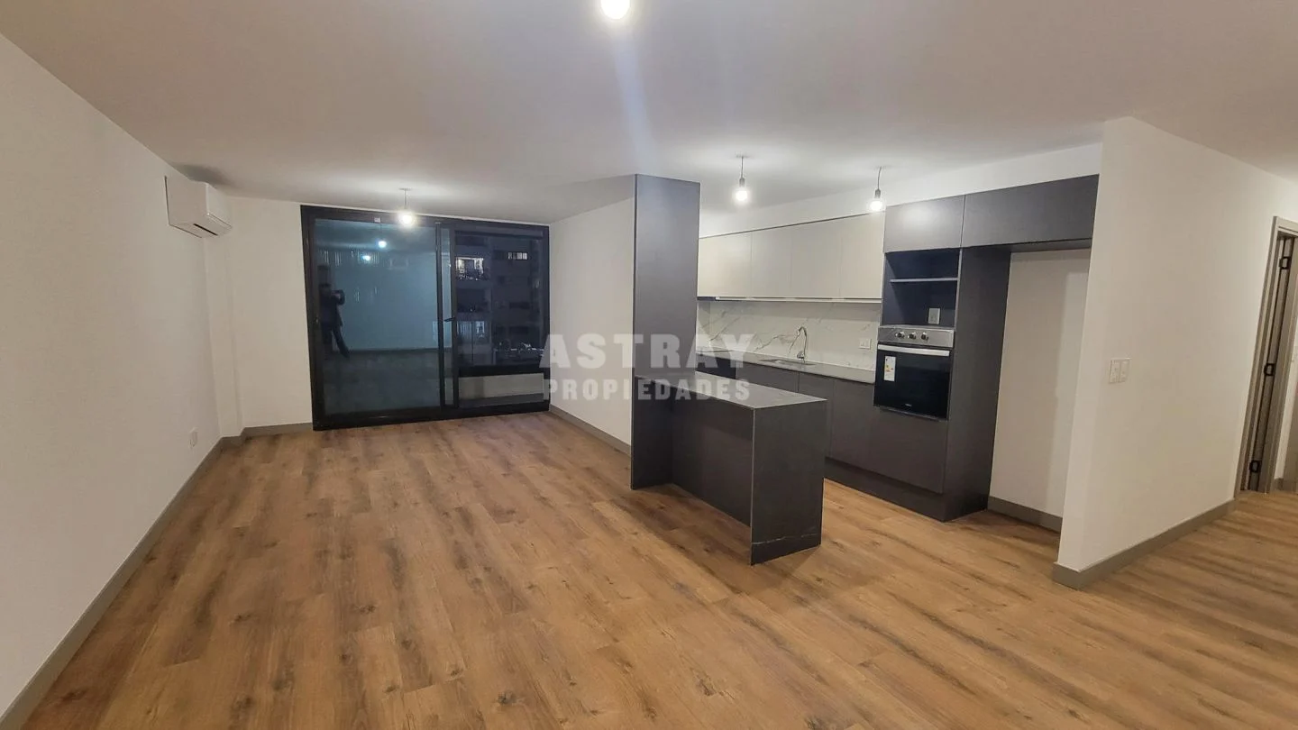 Living comedor de generosas dimensiones, con cocina semi integrada.