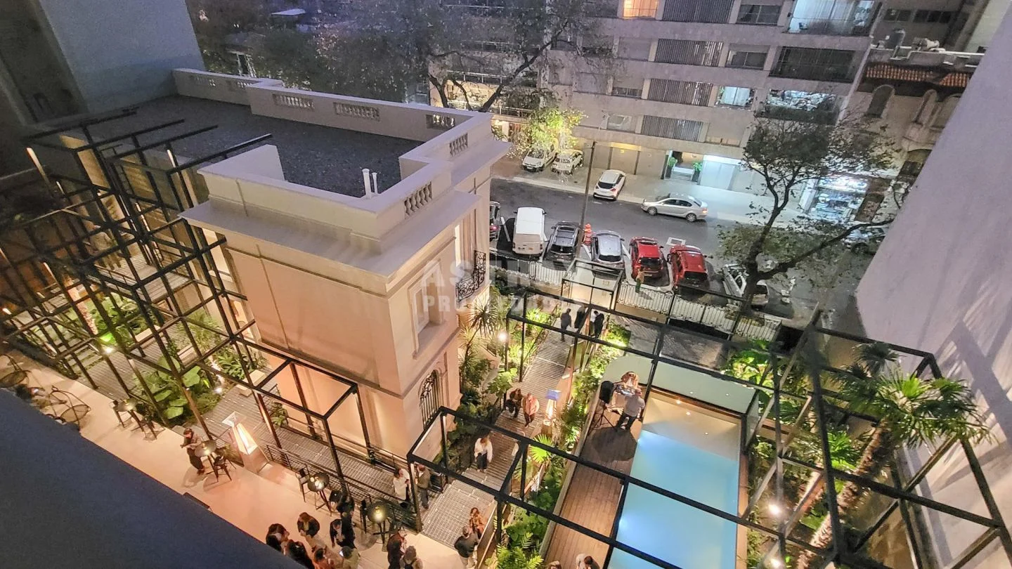 Predio con amplios jardines y variedad de amenities: piscina, solarium, gimnasio, sauna, salón de fiestas y laundry.