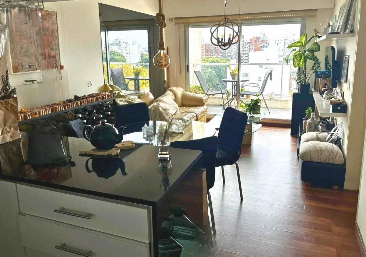 40 m² cocina con barra integrada al living-comedor, un dormitorio en Suite y gran balcón.