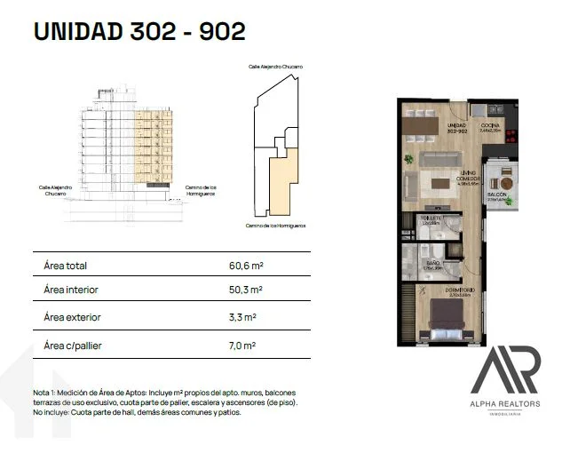 La unidad es la 302 y presenta una buena disposición privada teniendo el dormitorio en suite y el área social con baño de servicio (2 baños) y living comedor en el otro extremo de la planta. La cochera es en planta baja generando comodidad al ingreso y salida en el vehículo.