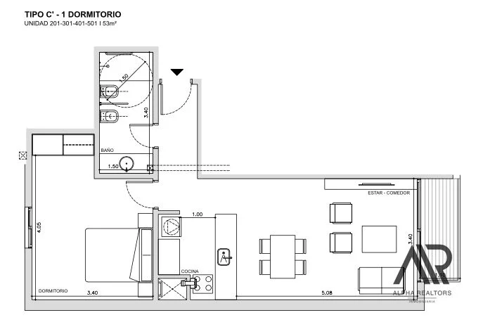 Amplio espacio de living comedor y cocina de 5 x 3,40 mts.
