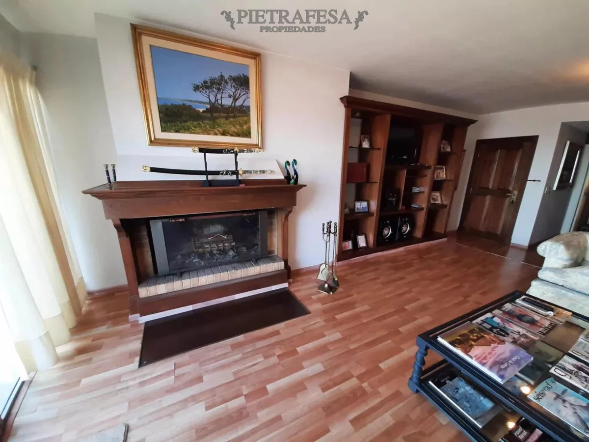 Amplio living comedor con estufa a leña y buena iluminación.