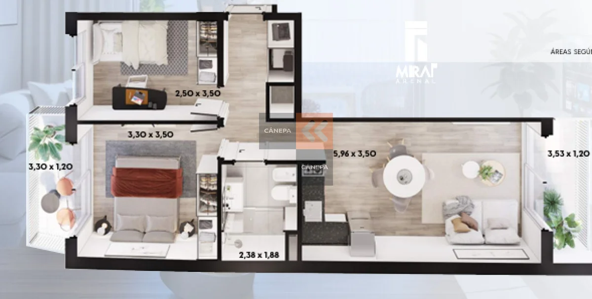 Living comedor con terraza Cocina integrada 2 dormitorios, uno con terraza en contrafrente 1 baño Amenities del edificio Con garaje simple USD 177.000 o doble USD 187.000 Fecha de entrega Marzo de 2026. Referencia Interna : Tera-14615