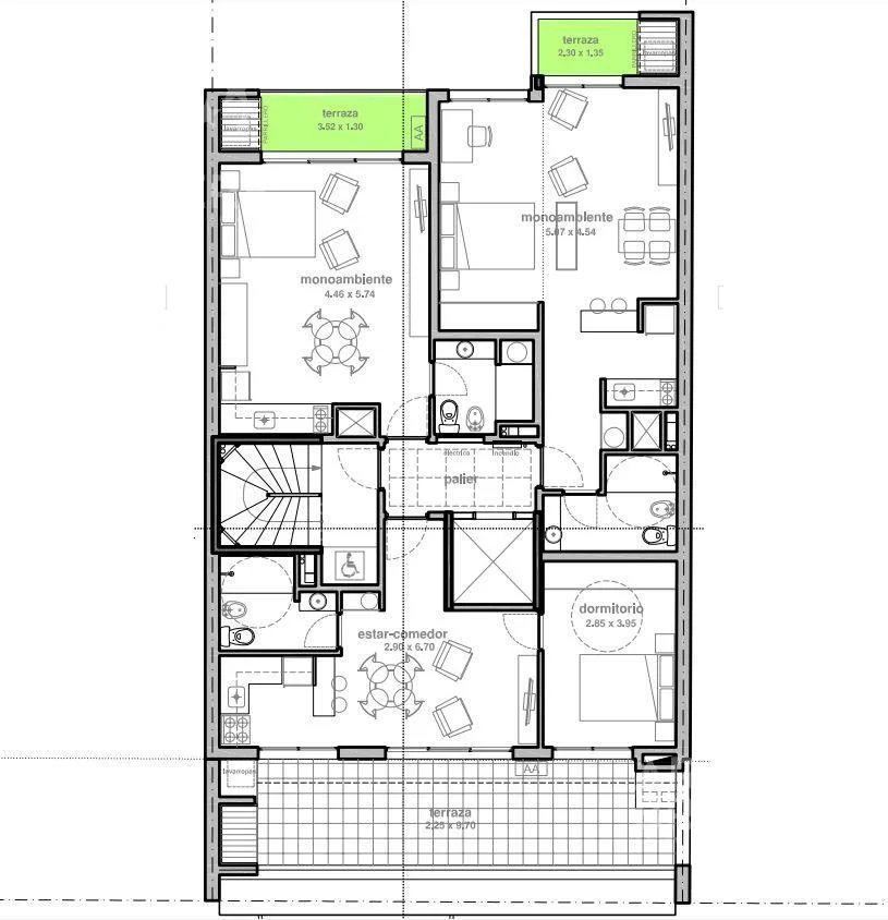 Monoambiente con terraza al frente, cocina integrada y 1 baño.