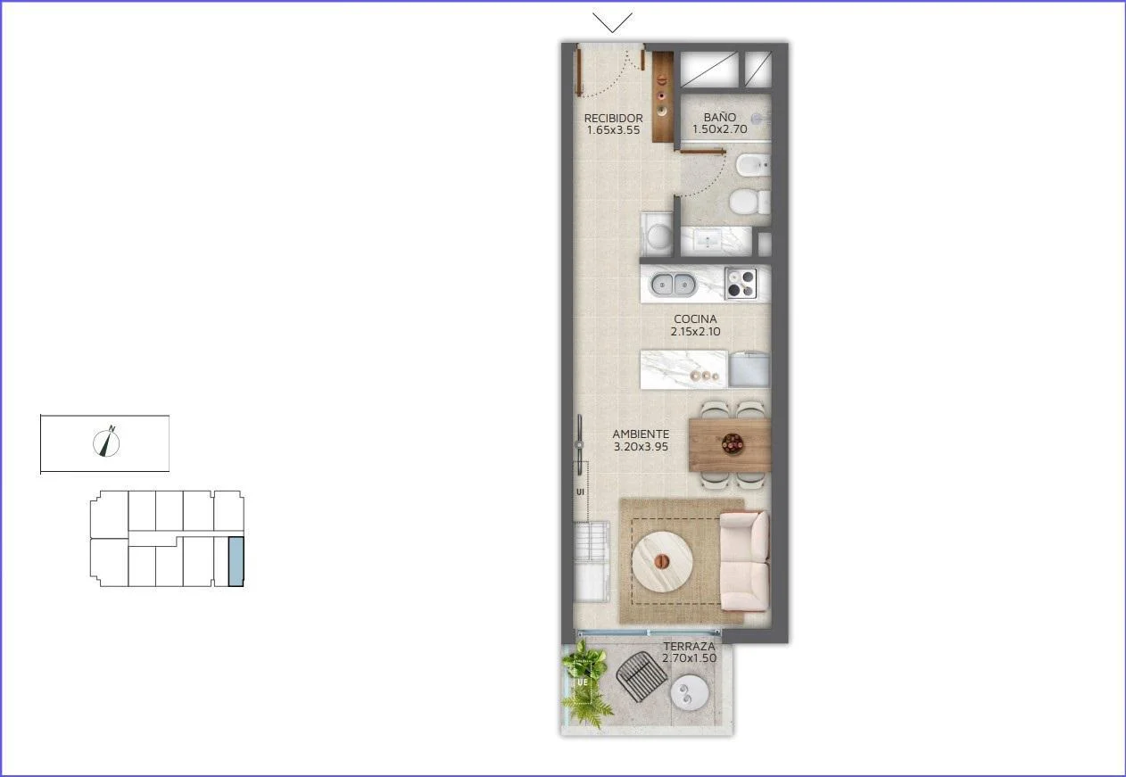 Monoambiente con terraza al frente, cocina integrada con placares y campana, horno y anafe, 1 baño completo.