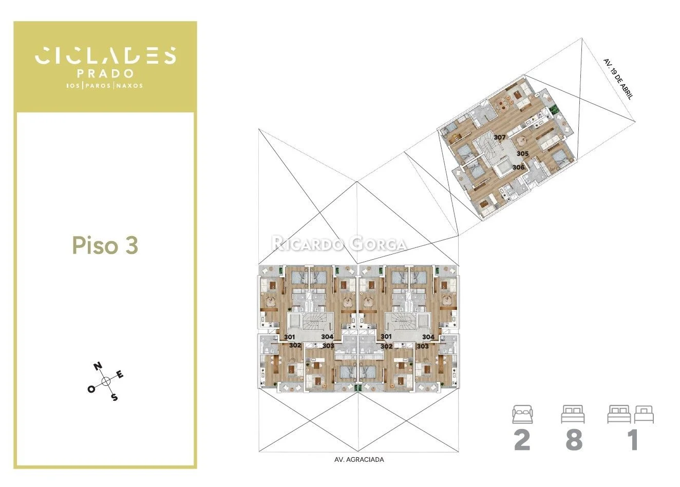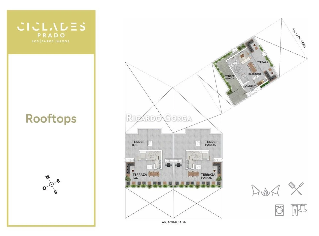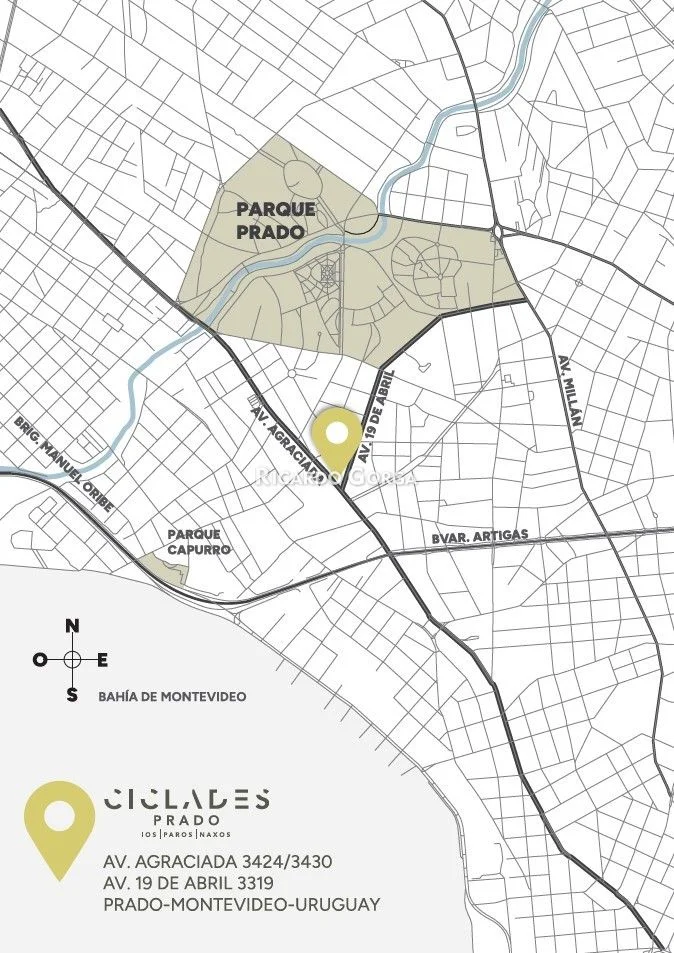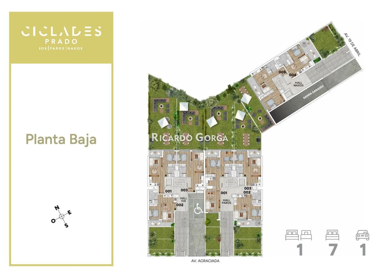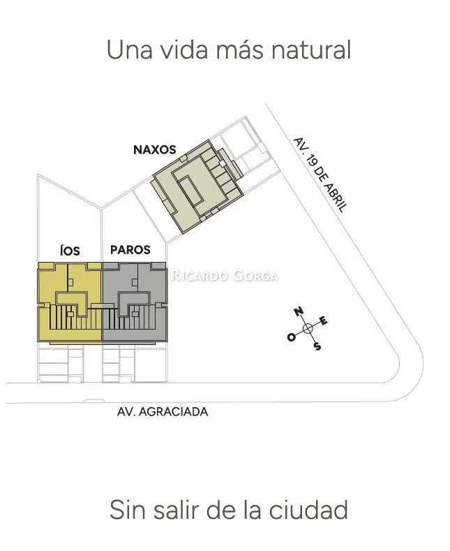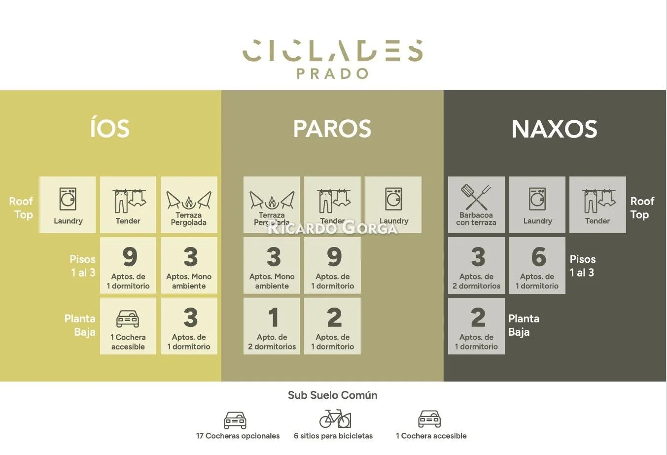 Cíclades Prado en un condominio de tres edificios, IOS, PAROS, NAXOS. implantado en un predio que atraviesa la manzana y le abre frente a dos avenidas icónicas del barrio: Av. Agraciada y Av. 19 de Abril.