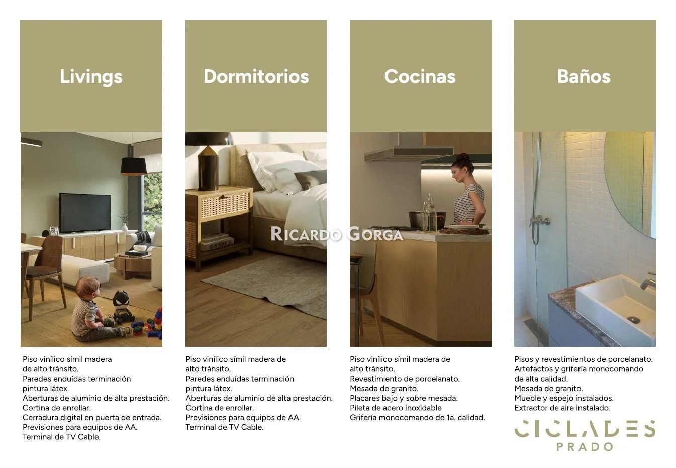 Living y dormitorio: Pisos vinílicos simil madera de alto tránsito, aberturas de aluminio, cortinas de enrollar, cerradura digital en puerta de ingreso, previsión para AA y TV cable