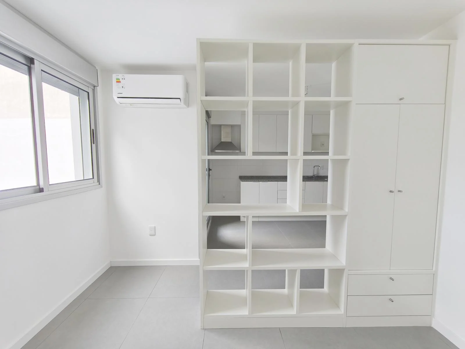 Ambiente principal con mueble divisorio, con estantes y placard.