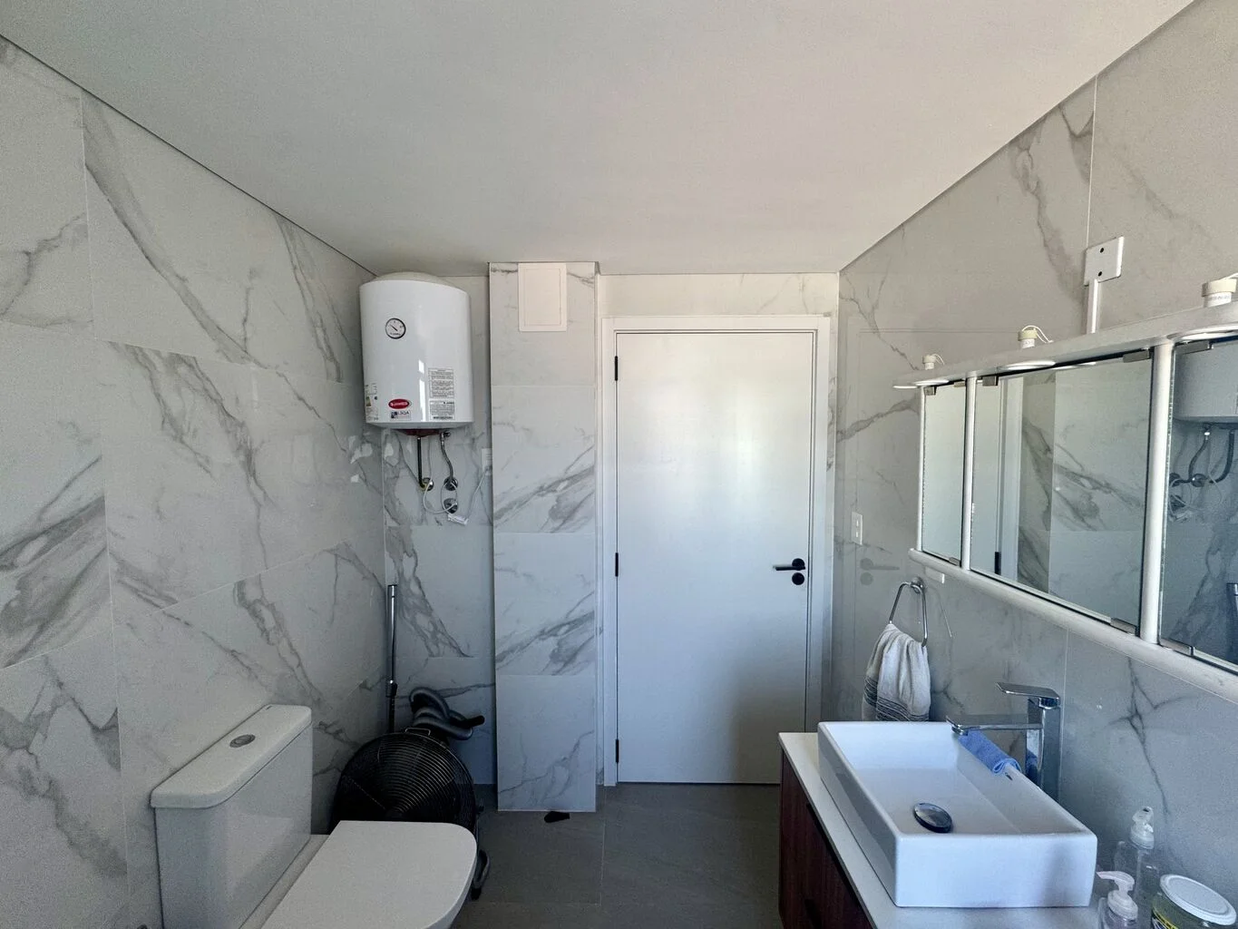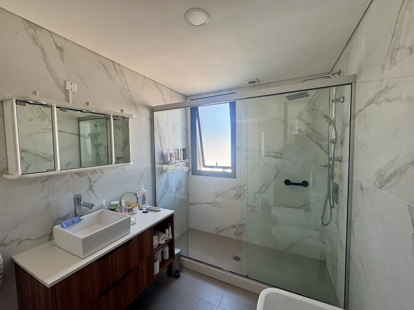 Baño completo espacioso, con ventilacion propia, mamapara de vidrio colocada, muy moderno.