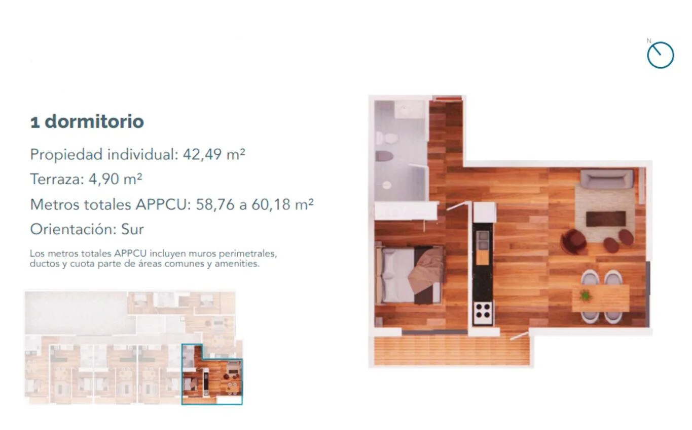 Se ubica en piso intermedio y cuenta con 42 m² internos más casi 5 m² de terraza. Por su condición de esquina, el dormitorio y la terraza orientan al oeste, con muy buena luz natural.