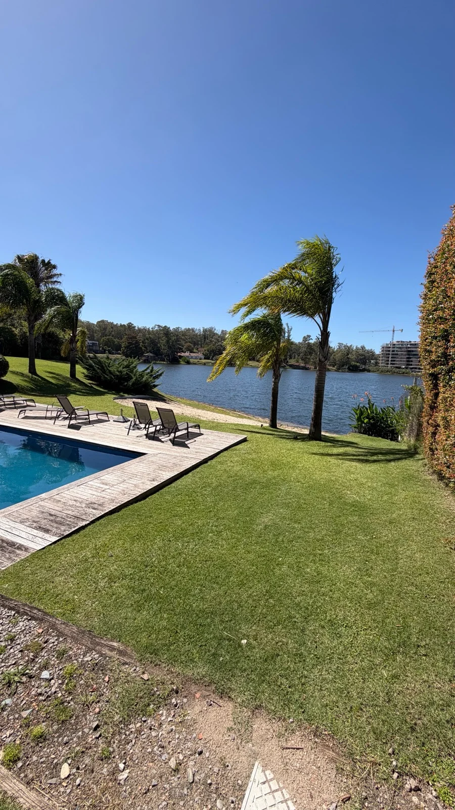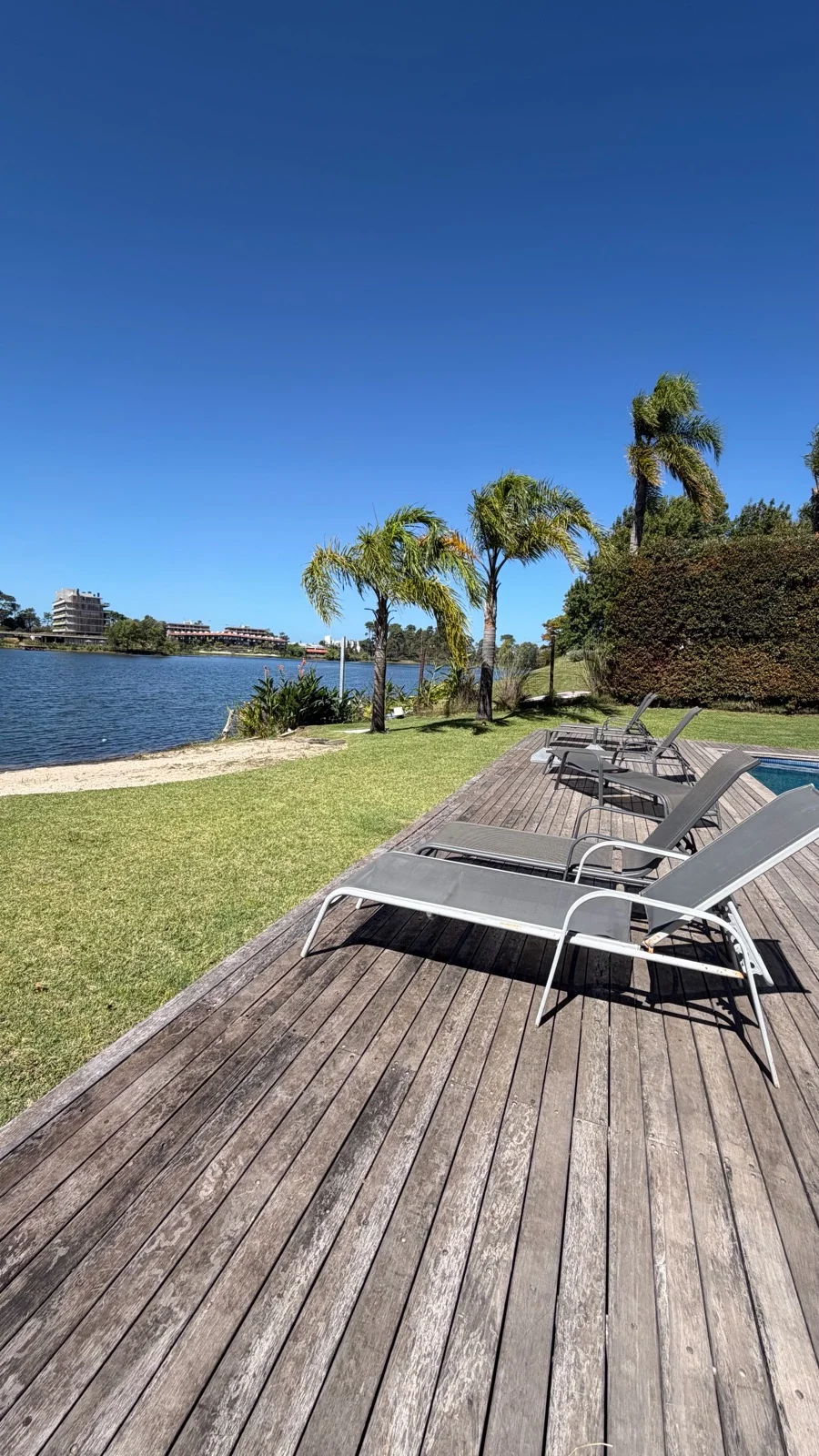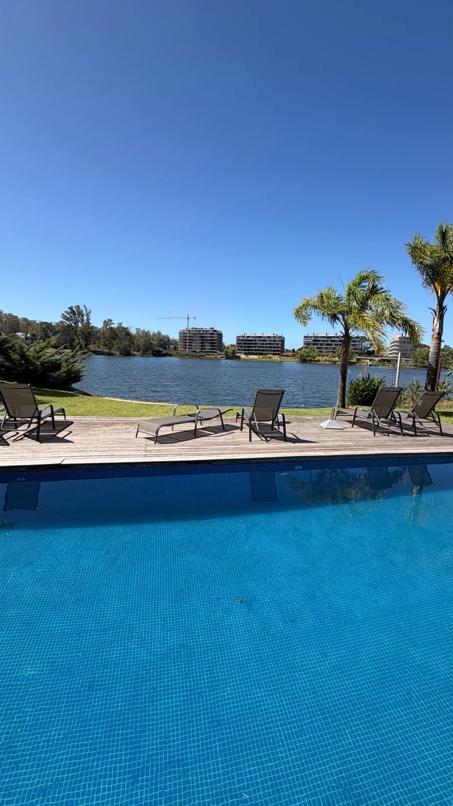 Piscina con vista despejada hacia el lago y barbacoa de uso compartido.