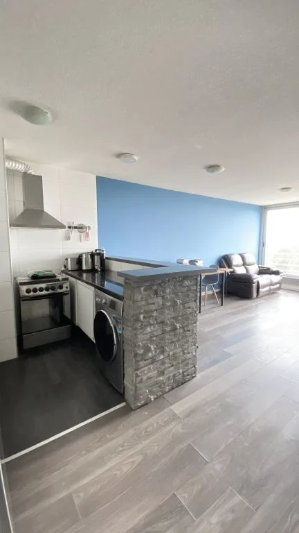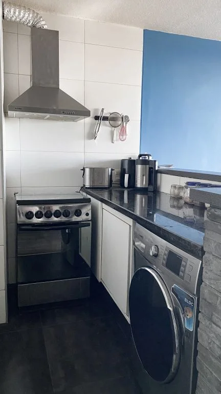 Cocina cómoda integrada por barra al living con campana y espacio para lavarropas.