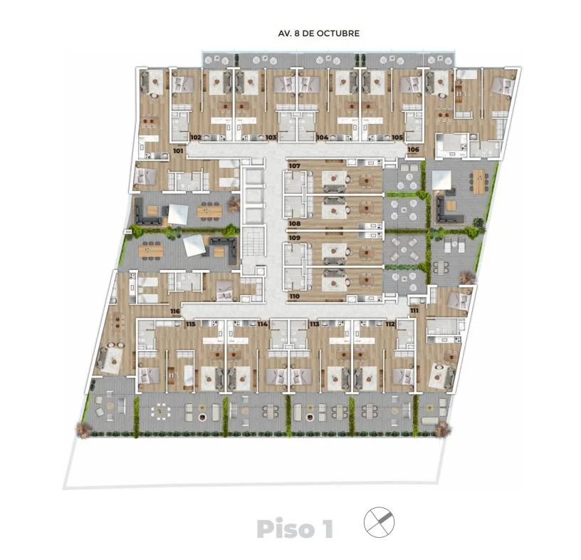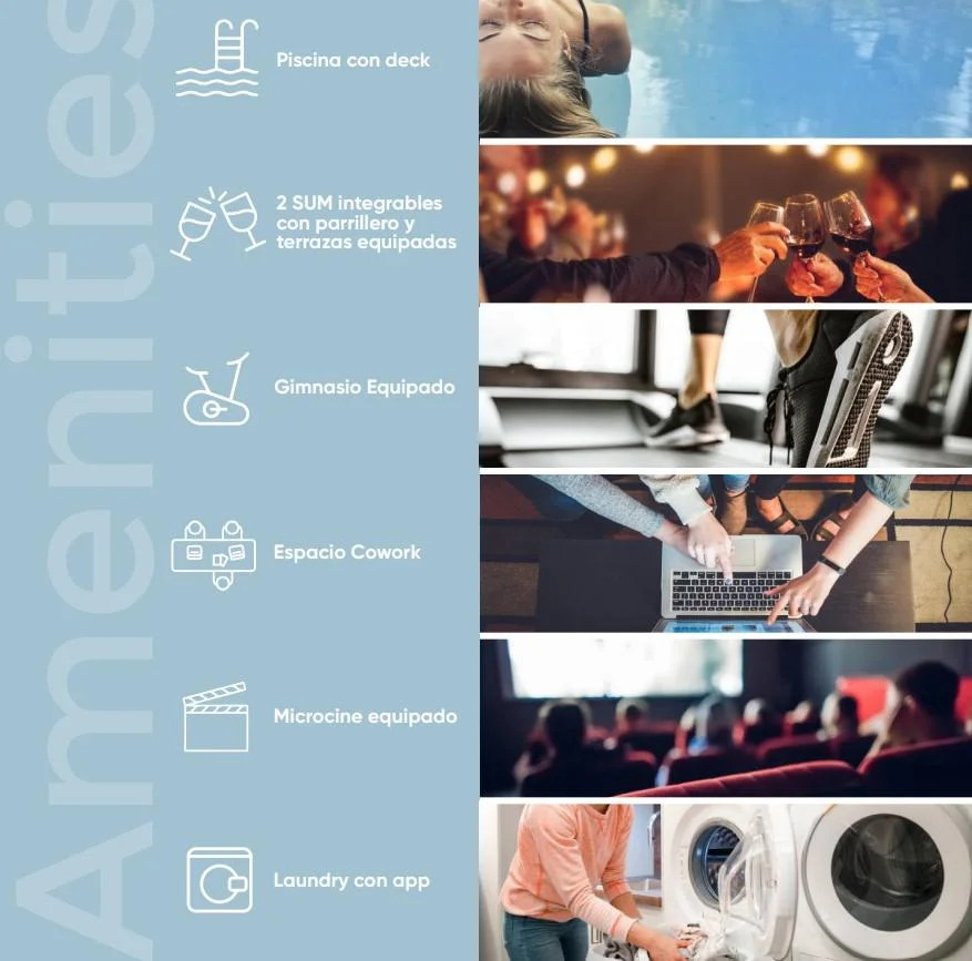 Amenities: Piscina con deck/ 2 Sum integrables con parrillero y terrazas equipadas/ Gimnasio equipado/ Espacio Cowork/ Microcine equipado/ Loundry con app