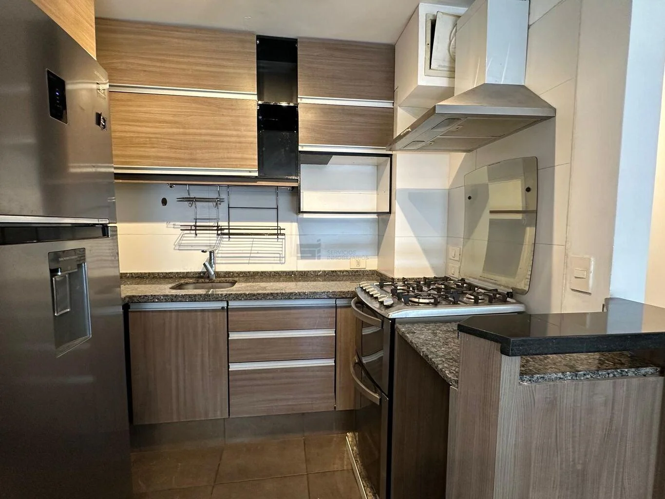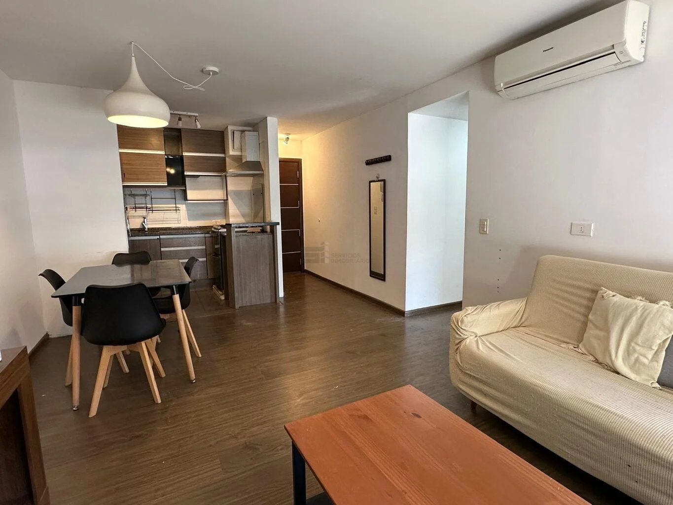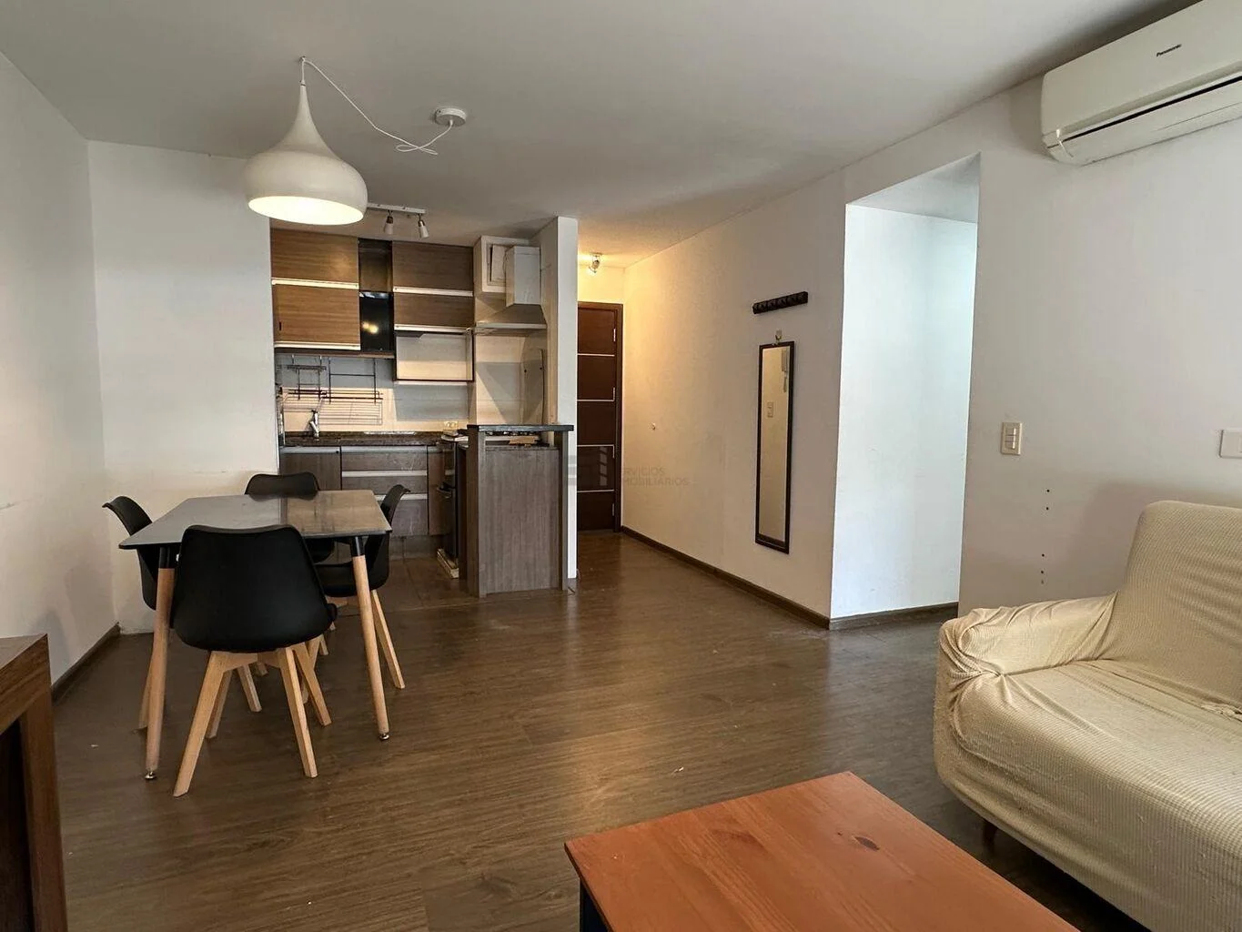 La unidad ofrece un living comedor amplio y luminoso, equipado con aire acondicionado, muebles completos y ventanales al frente. La cocina integrada se presenta moderna y funcional, con muy buen espacio de guardado, heladera, cocina y extractor.