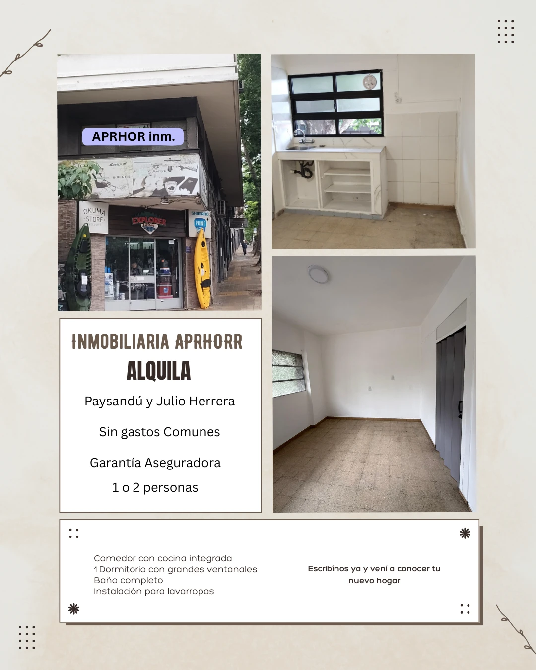 Apartamento al frente en primer piso en la esquina de Paysandú y Julio Herrera y Obes. Muy iluminado y ventilado, ¡¡¡Sin gastos comunes!!! Sí leíste bien, sin gastos comunes. Amplio living-comedor con cocina integrada, bajo mesada, extractor, conexión para lavarropas. Dormitorio con ventana a ambas calles. Baño completo. ideal para quienes buscan un espacio funcional y disfrutable. Zona con gran conectividad y todos los servicios. Transporte interdepartamental pasa por la puerta, 500 metros de 18 de Julio. Condiciones 1 o 2 personas No se admiten mascotas Alquiler: $19.000 Sin gastos comunes Garantía PORTO, SURA, MAPFRE.