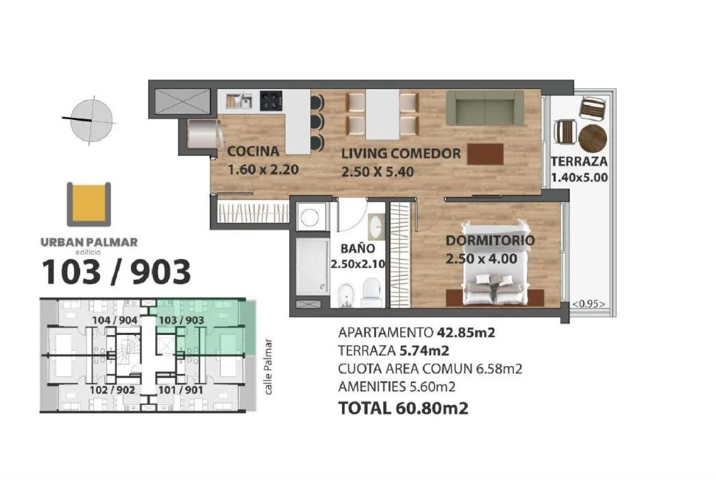 Luminoso con cocina integrada, salida a terraza al frente de buen tamaño.