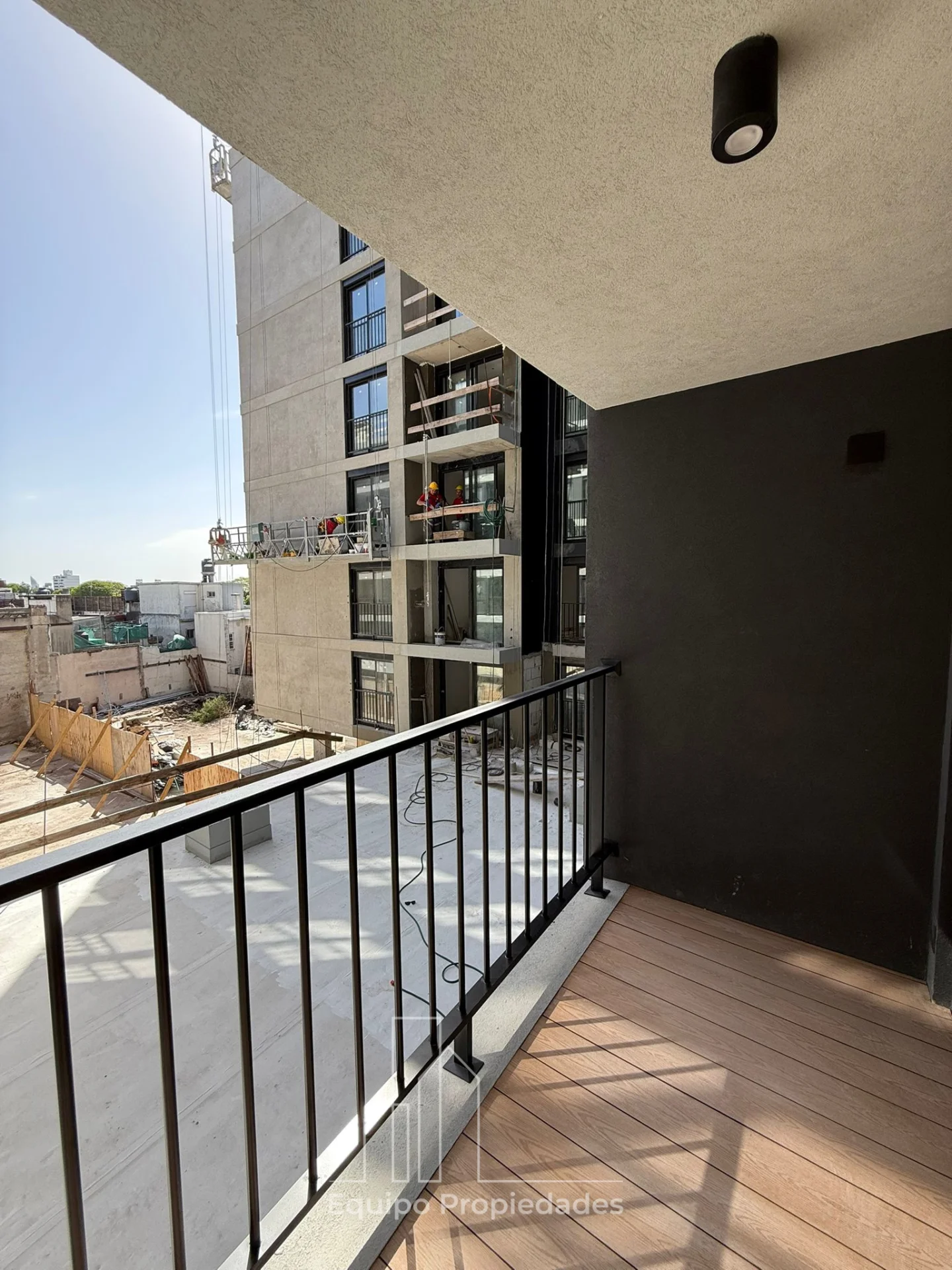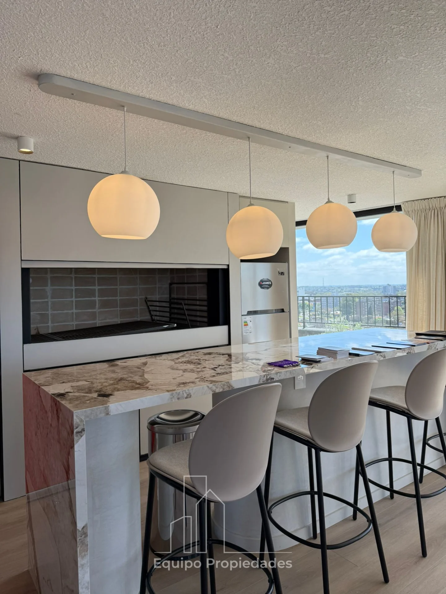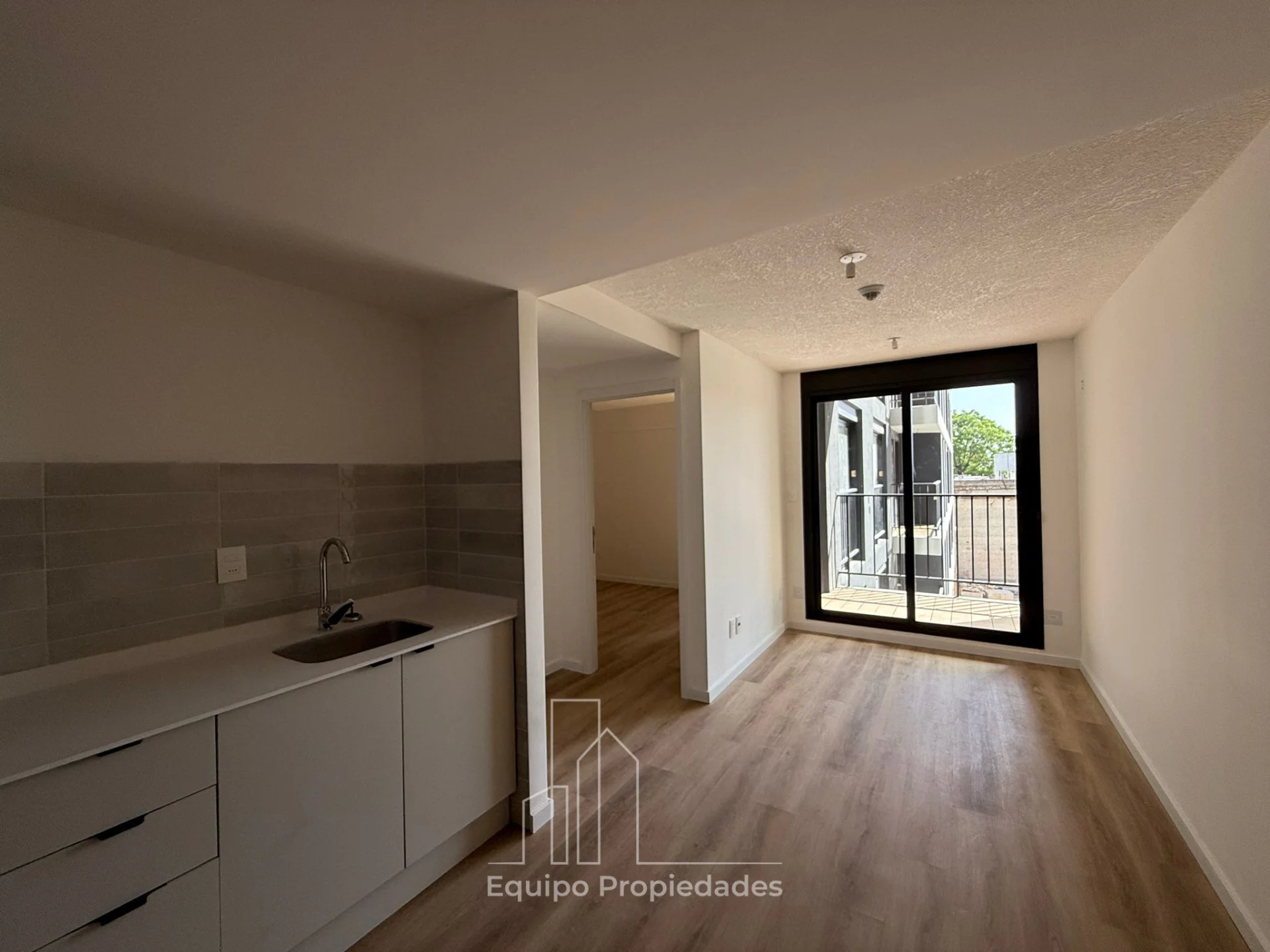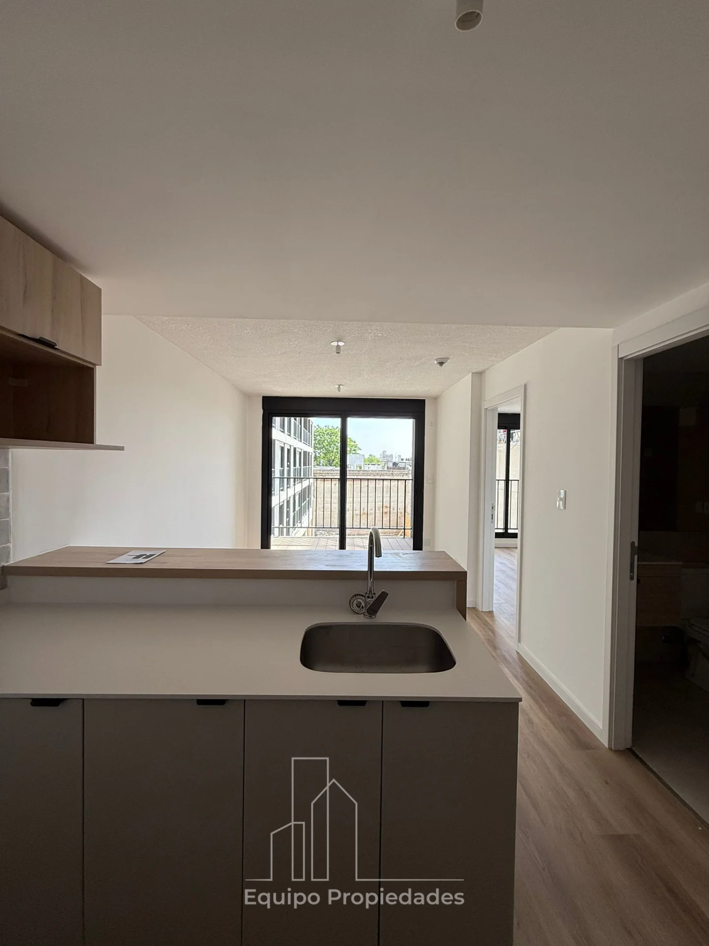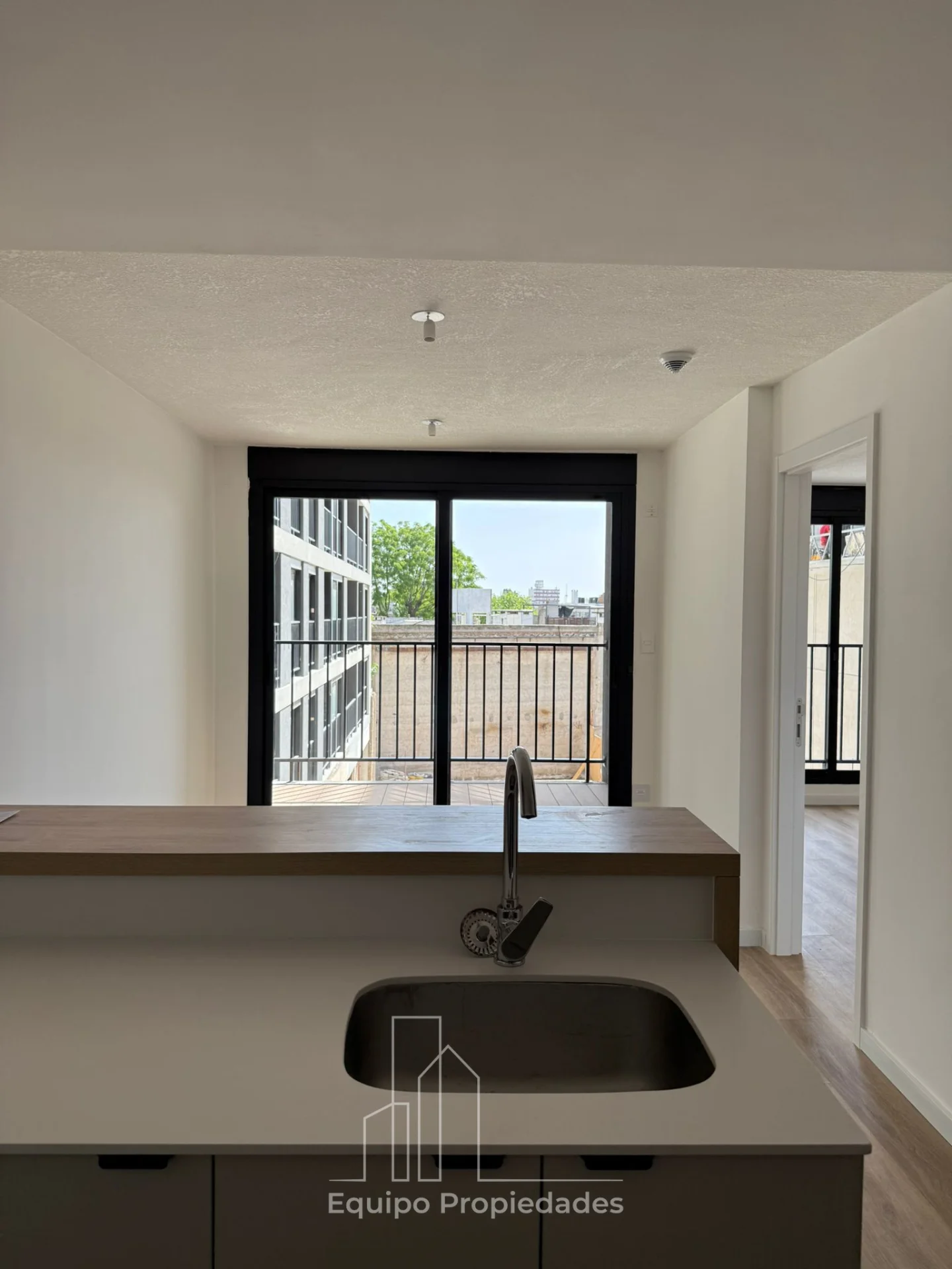 Living comedor con cocina integrada con barra y salida a muy lindo balcón.