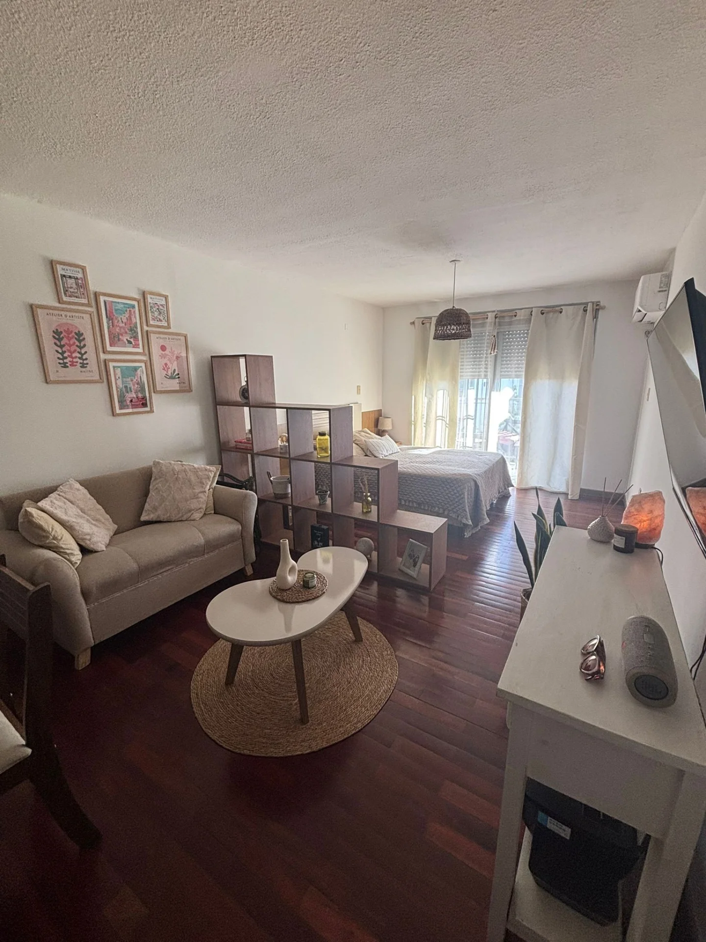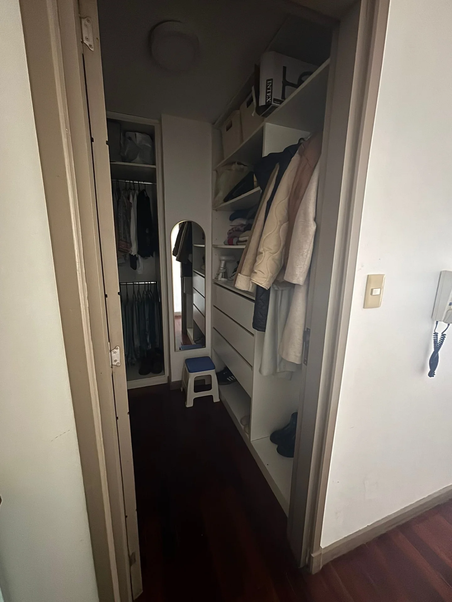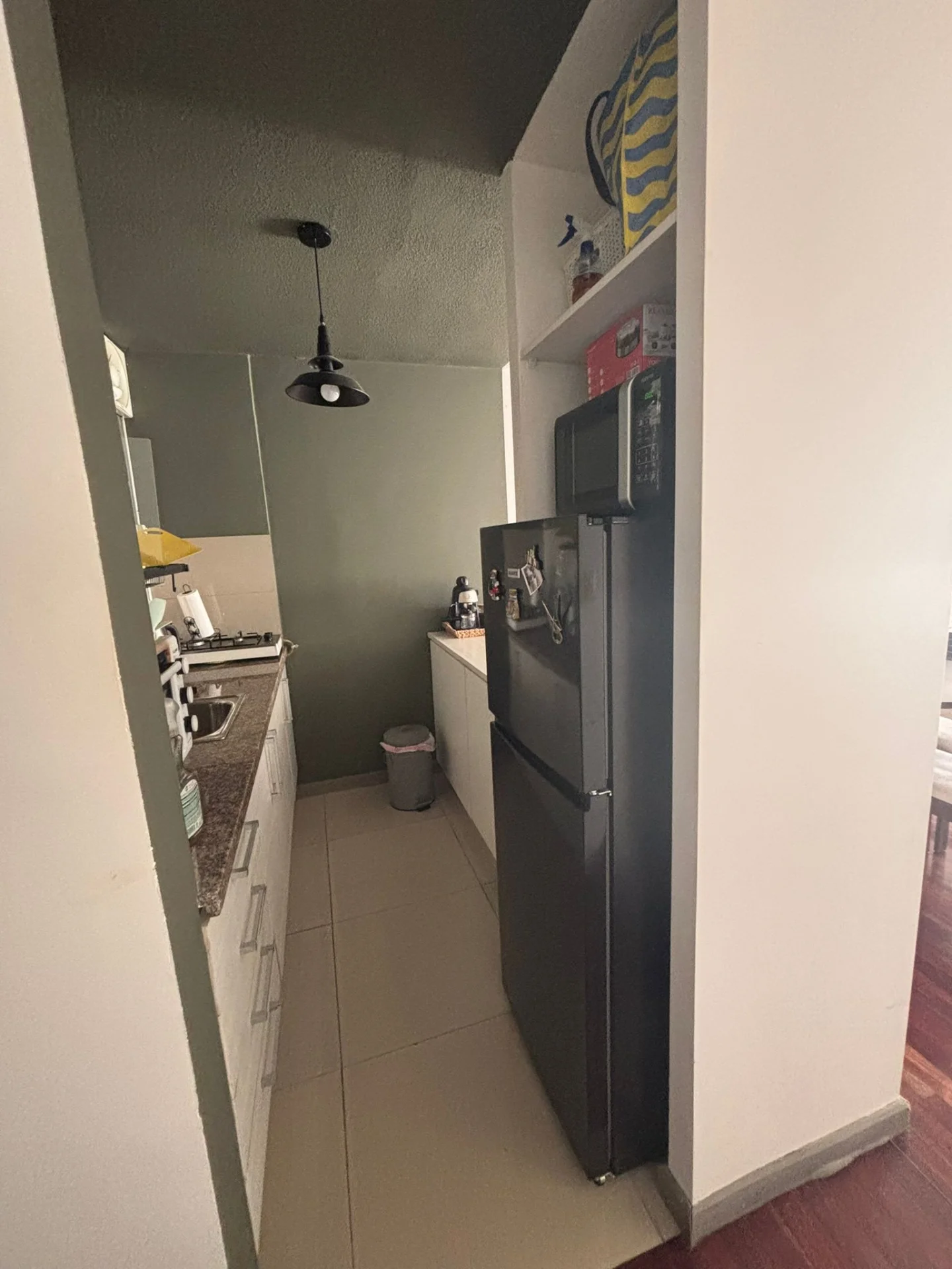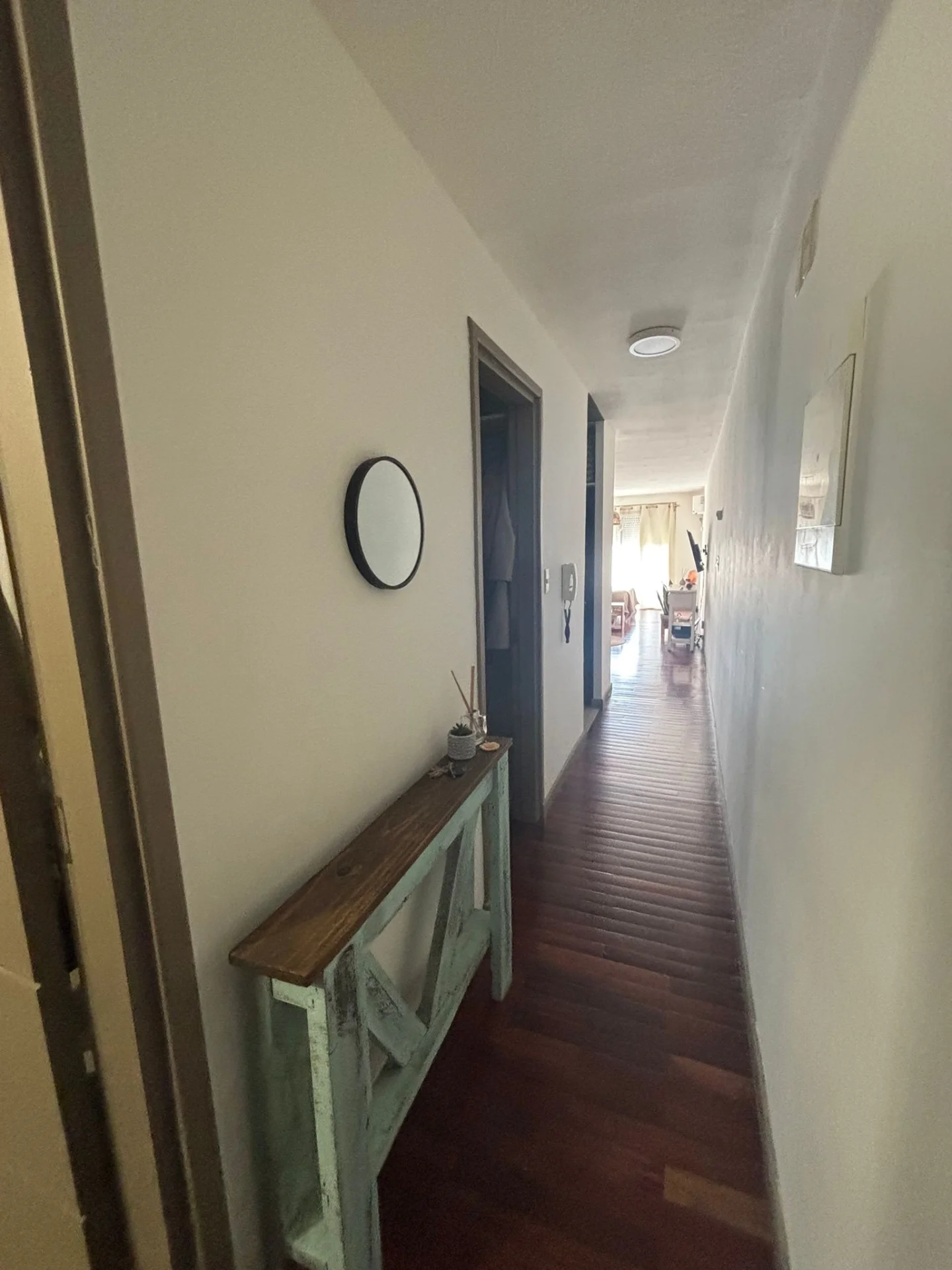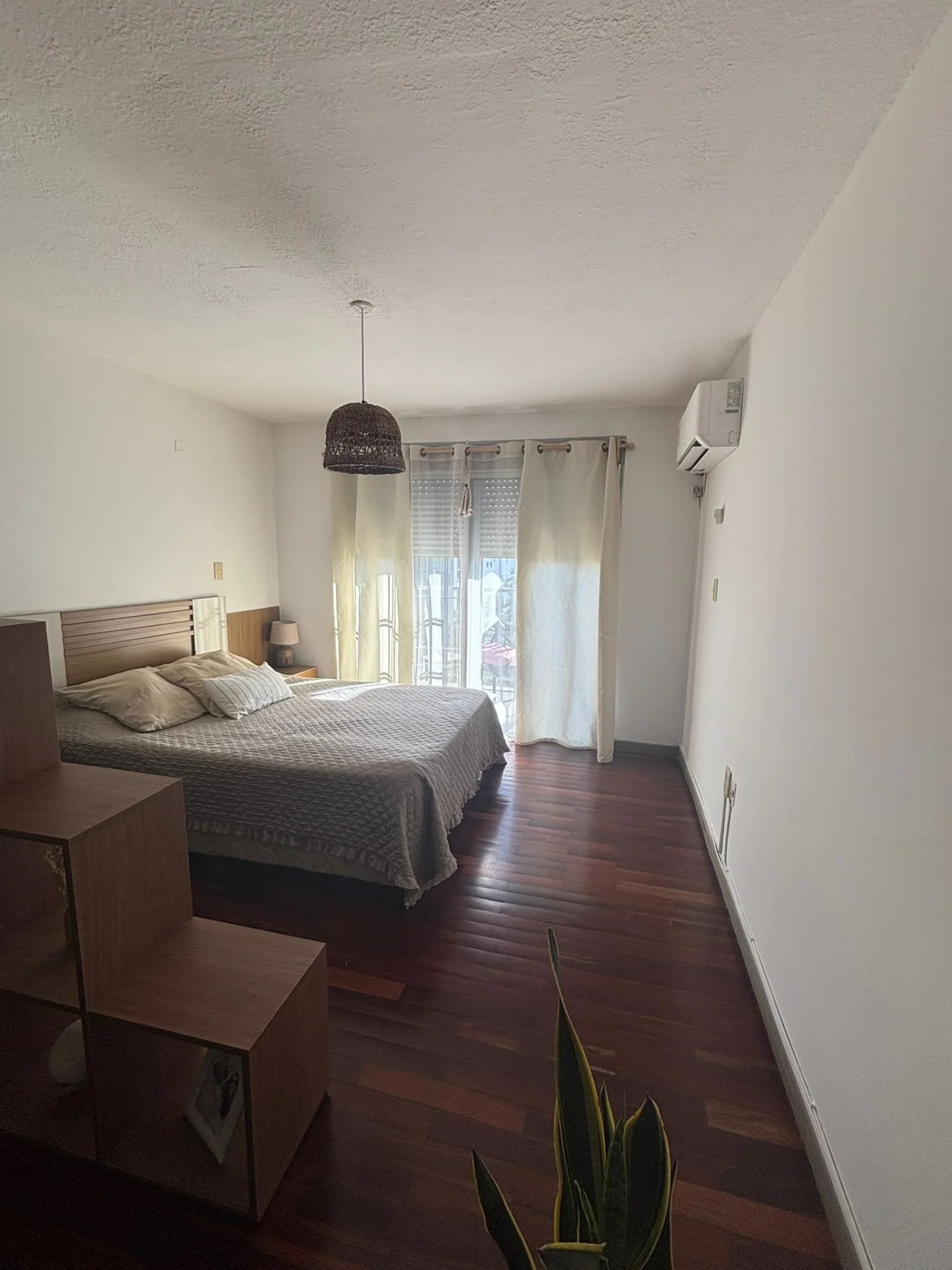 Vestidor con placares amplios empotrados , ambiente amplio con terraza al frente, pisos de parque en excelente estado , ventanal de aluminio con persiana y rejas y salida a balcón , cocina semi definida con placares bajo mesada y barra pása platos .
