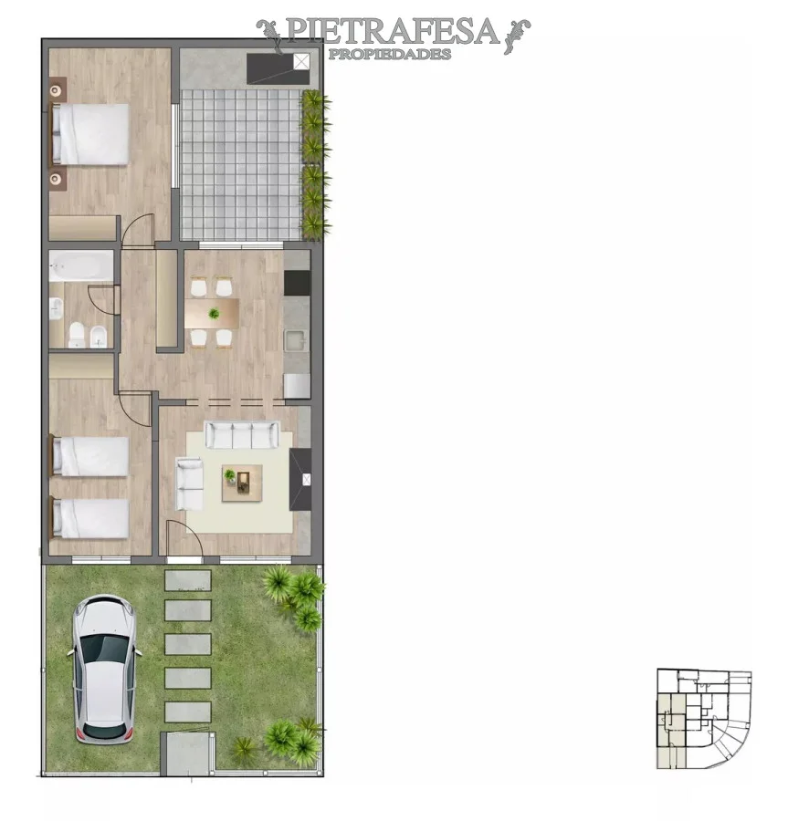 -jardín al frente con cochera y patio al fondo con parrillero.