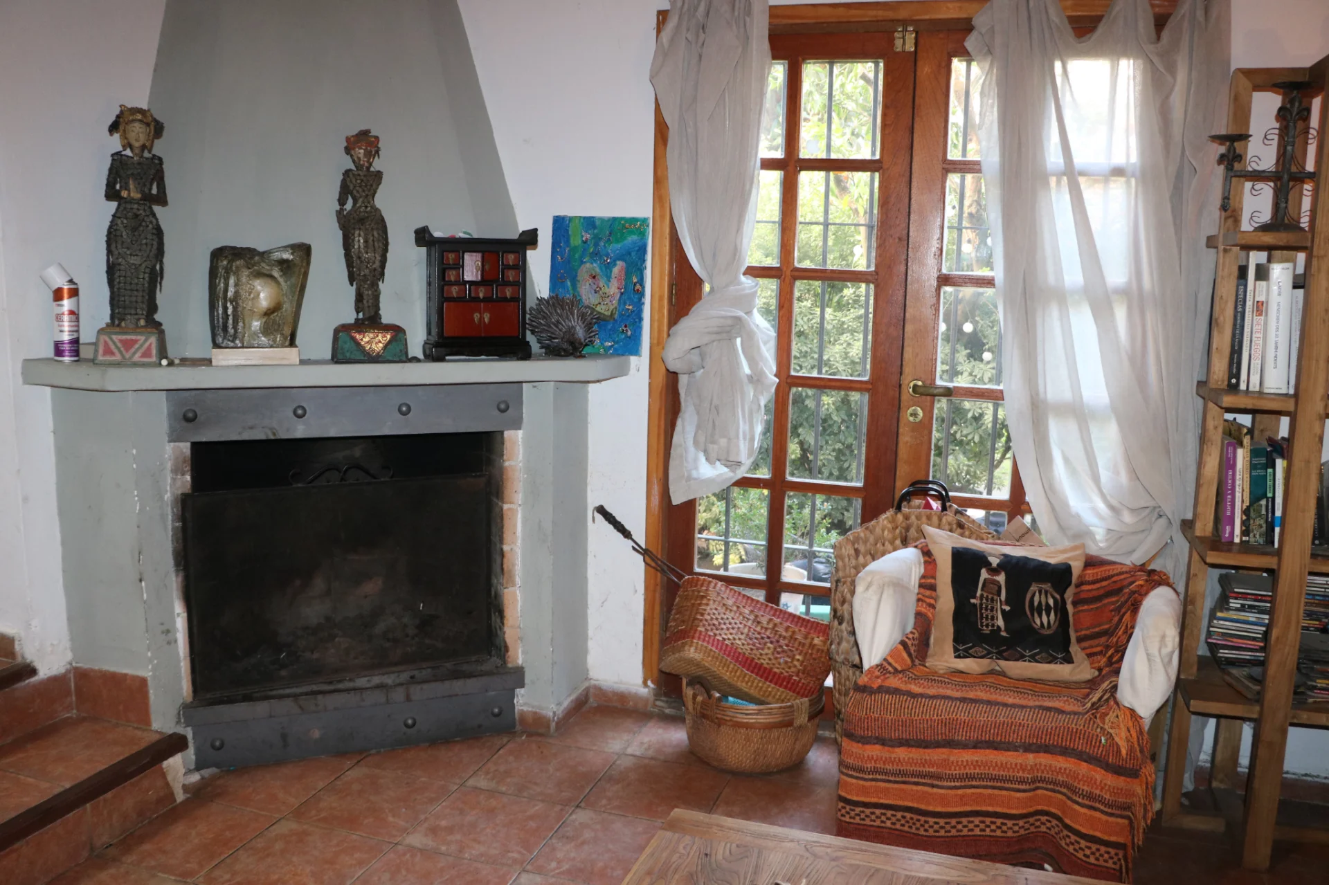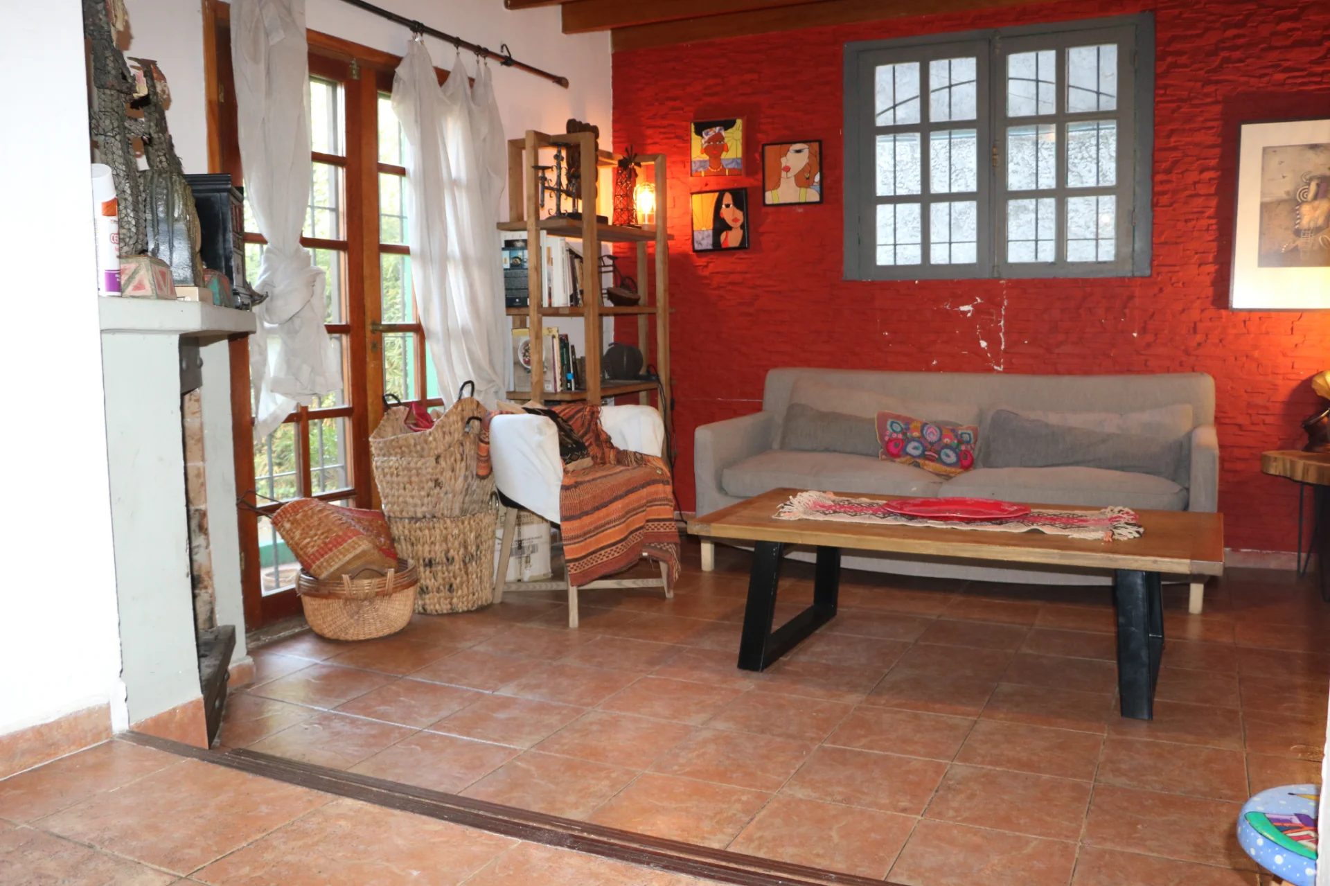 Casa principal con living con estufa a leña, cocina, baño y 3 dormitorios amplios.