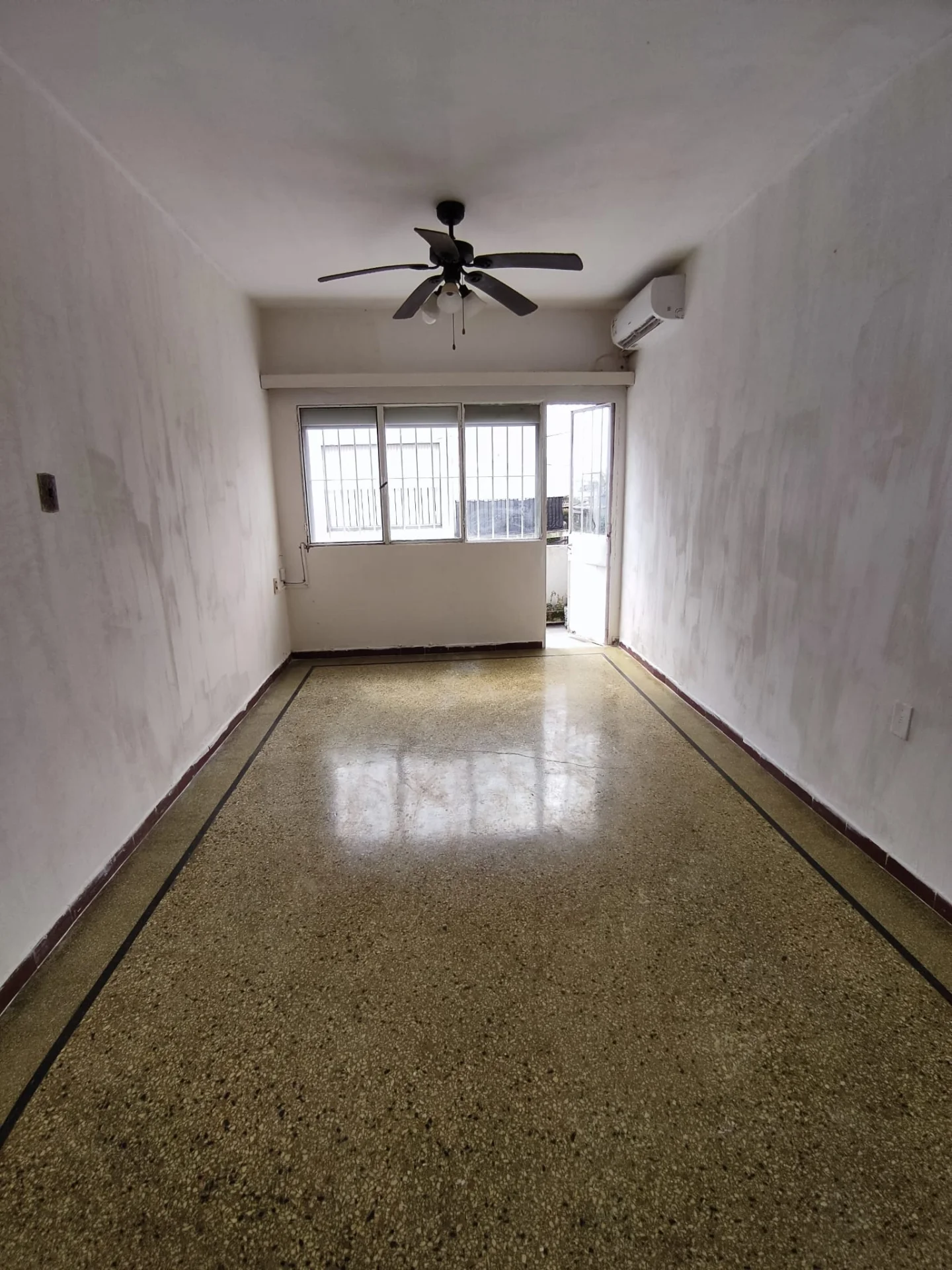 Living comedor, piso en Vinílico con balcón de uso exclusivo de buen metraje. Aire Acondicionado.
