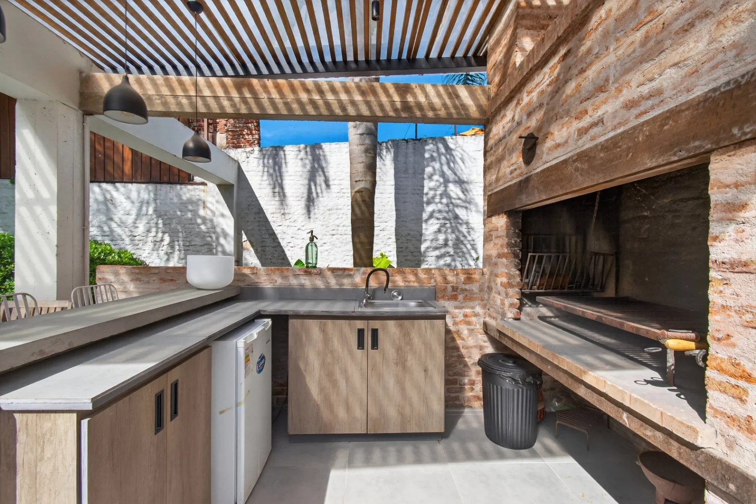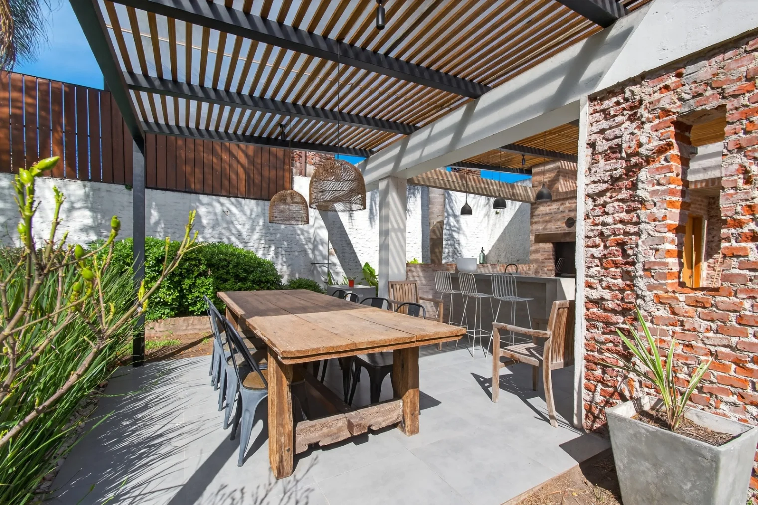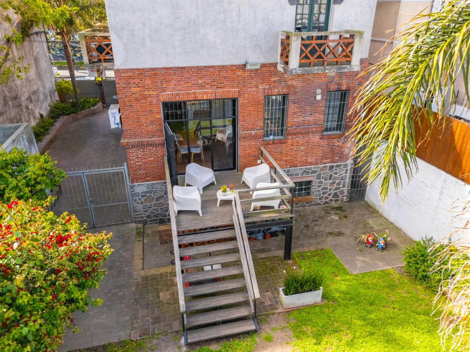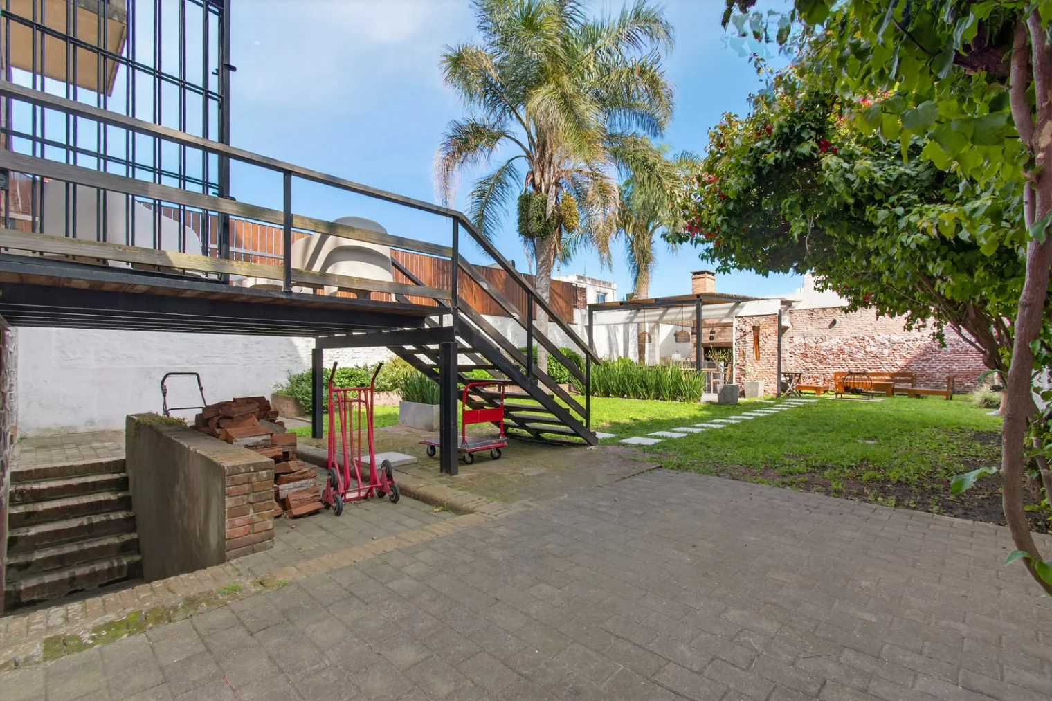 La casa cuenta con un amplio acceso lateral de 100m2 con espacio para varios vehículos y portón automatizado, a través del cual se accede a un fondo enjardinado de 230m2 que cuenta con una barbacoa techada de 35m2 con baño.