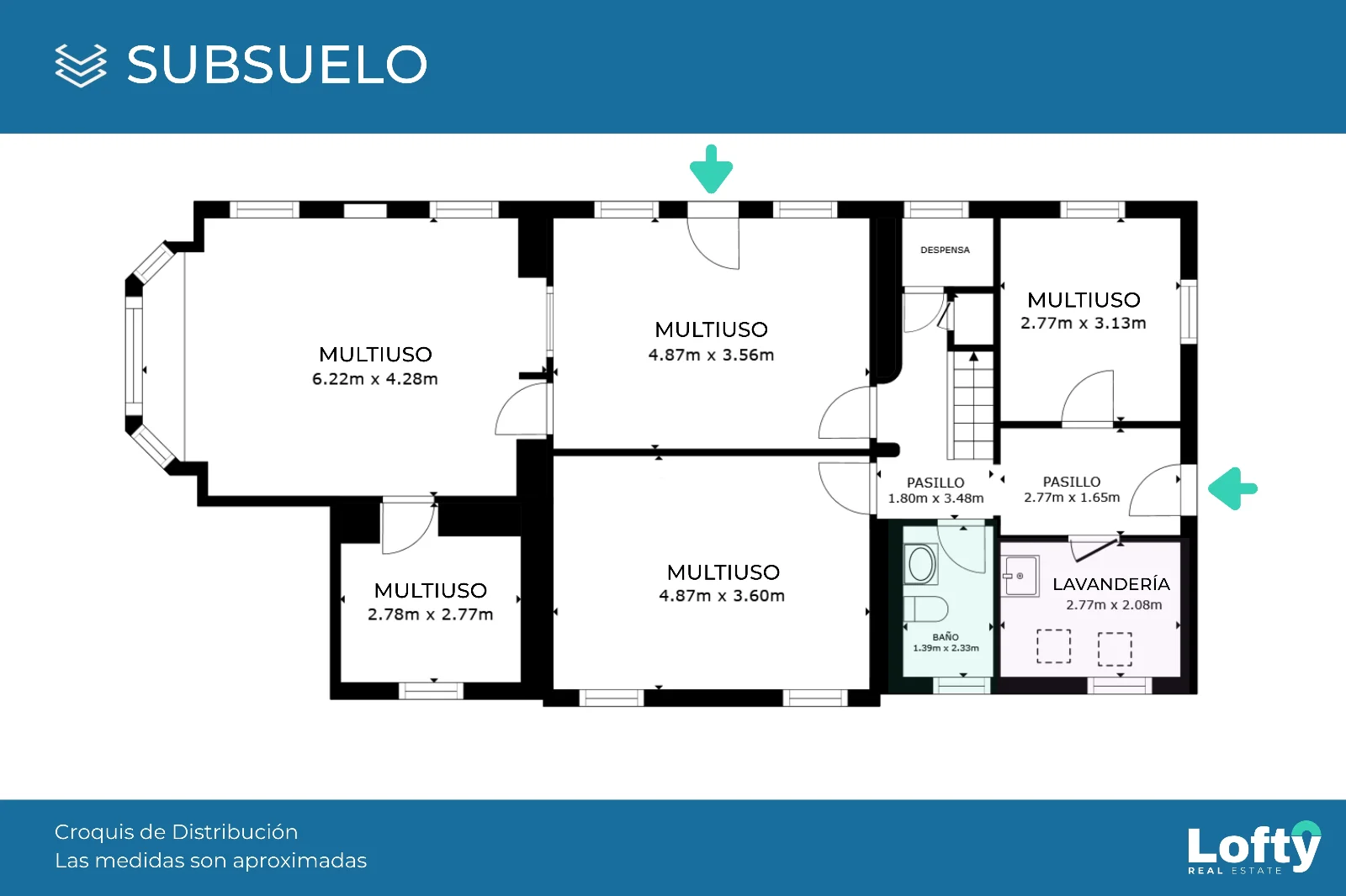 Se compone de cinco amplias habitaciones multiuso, más una habitación de lavandería y un baño completo, todas con ventanas al exterior. Al subsuelo se puede acceder por escalera desde la casa, o a través de dos ingresos desde el exterior.
