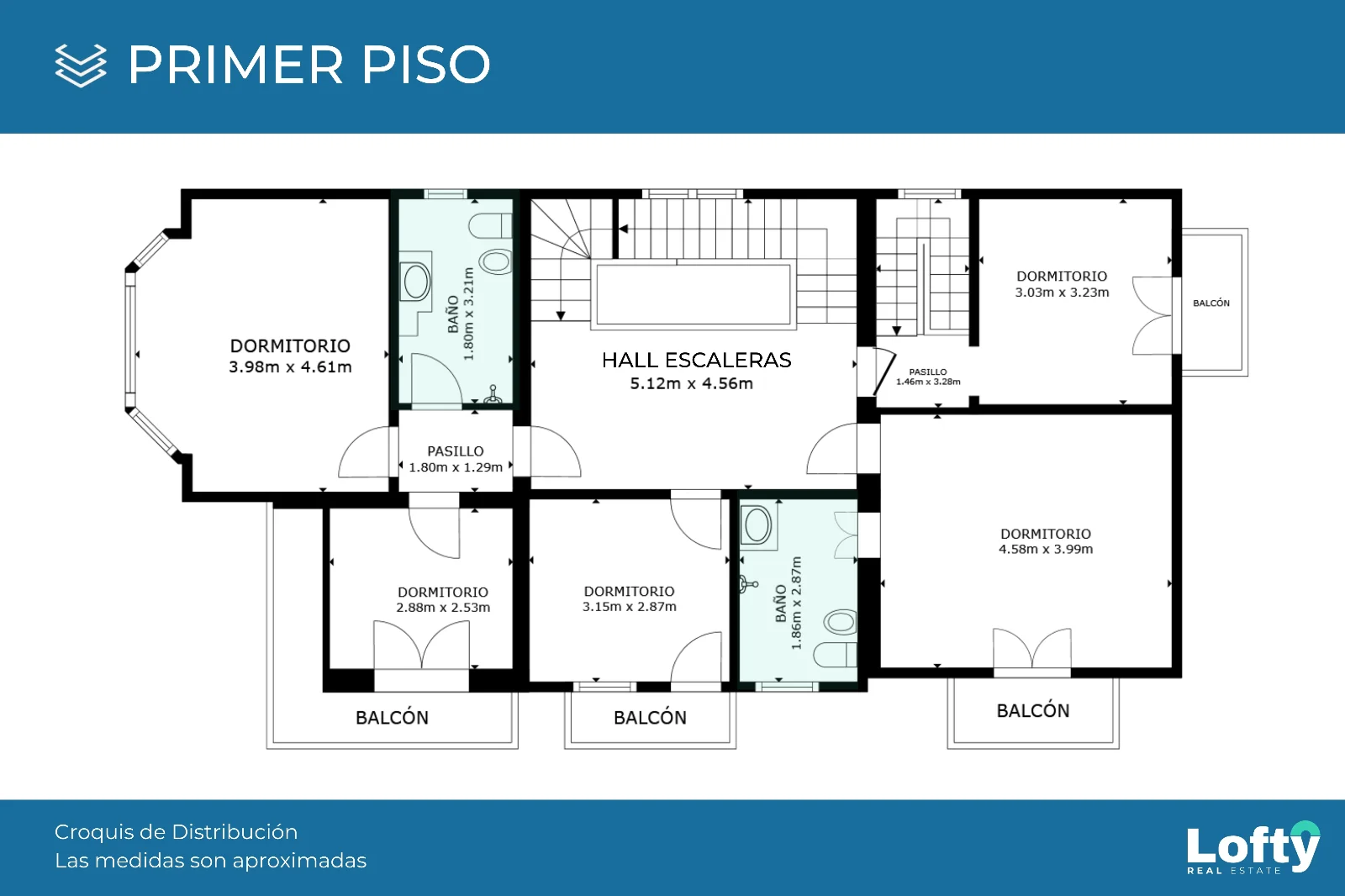 En este nivel se disponen cinco habitaciones, cuatro de ellas con balcón, y dos baños completos, uno de ellos en suite. Algunas de las habitaciones pueden utilizarse como escritorio o vestidor.