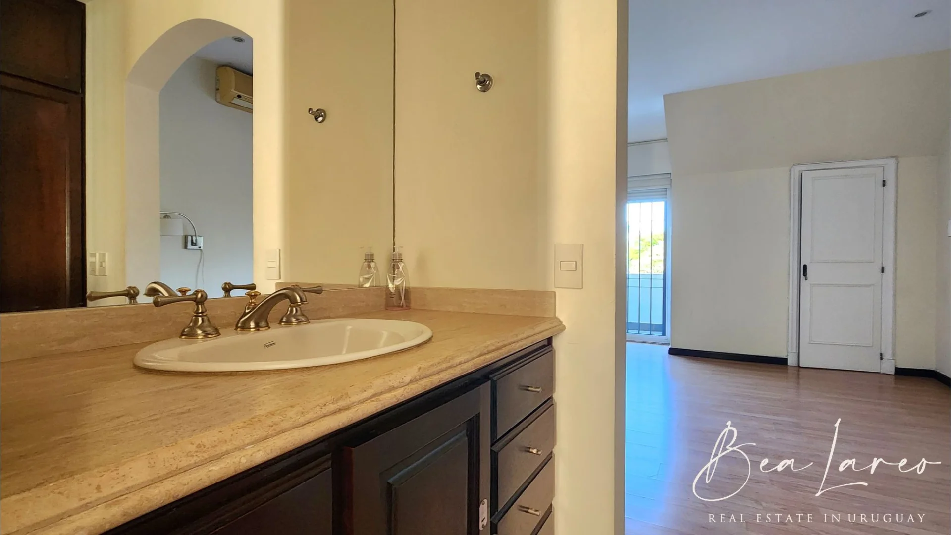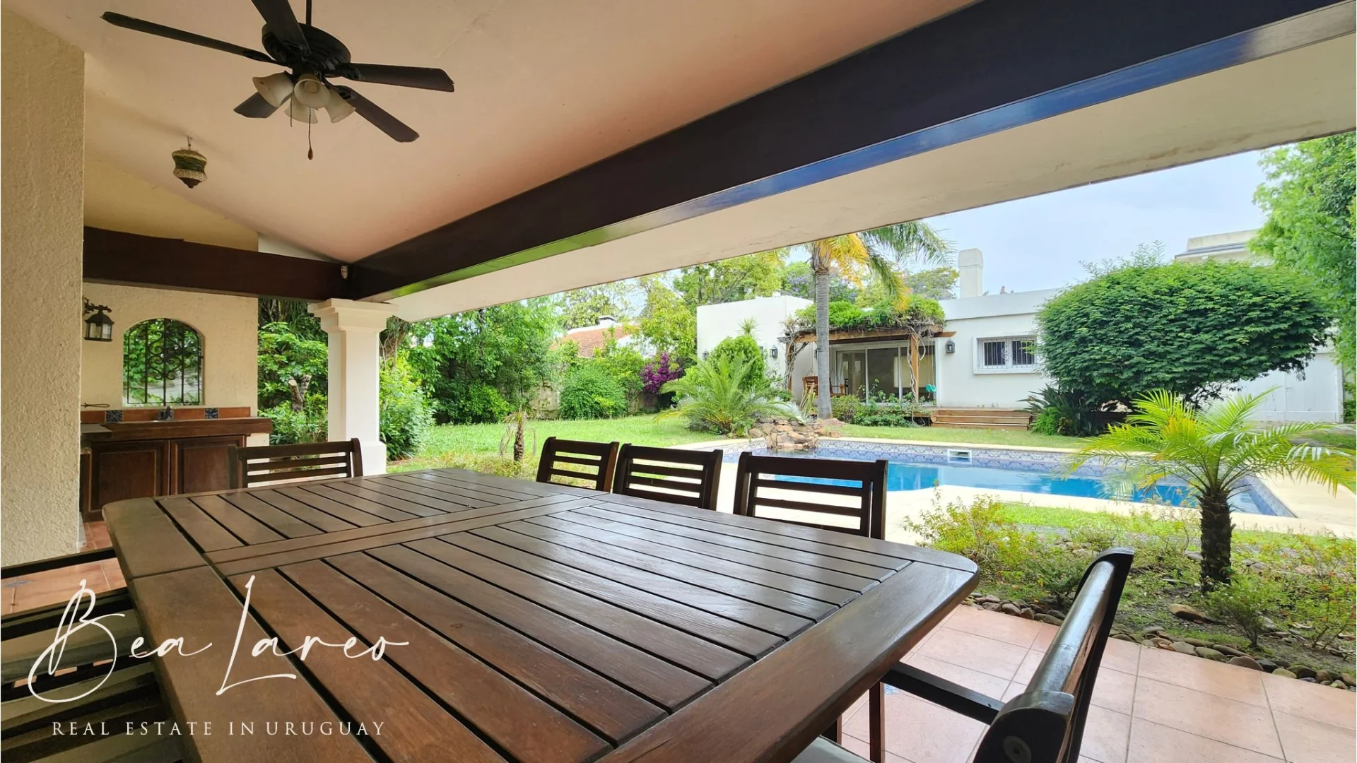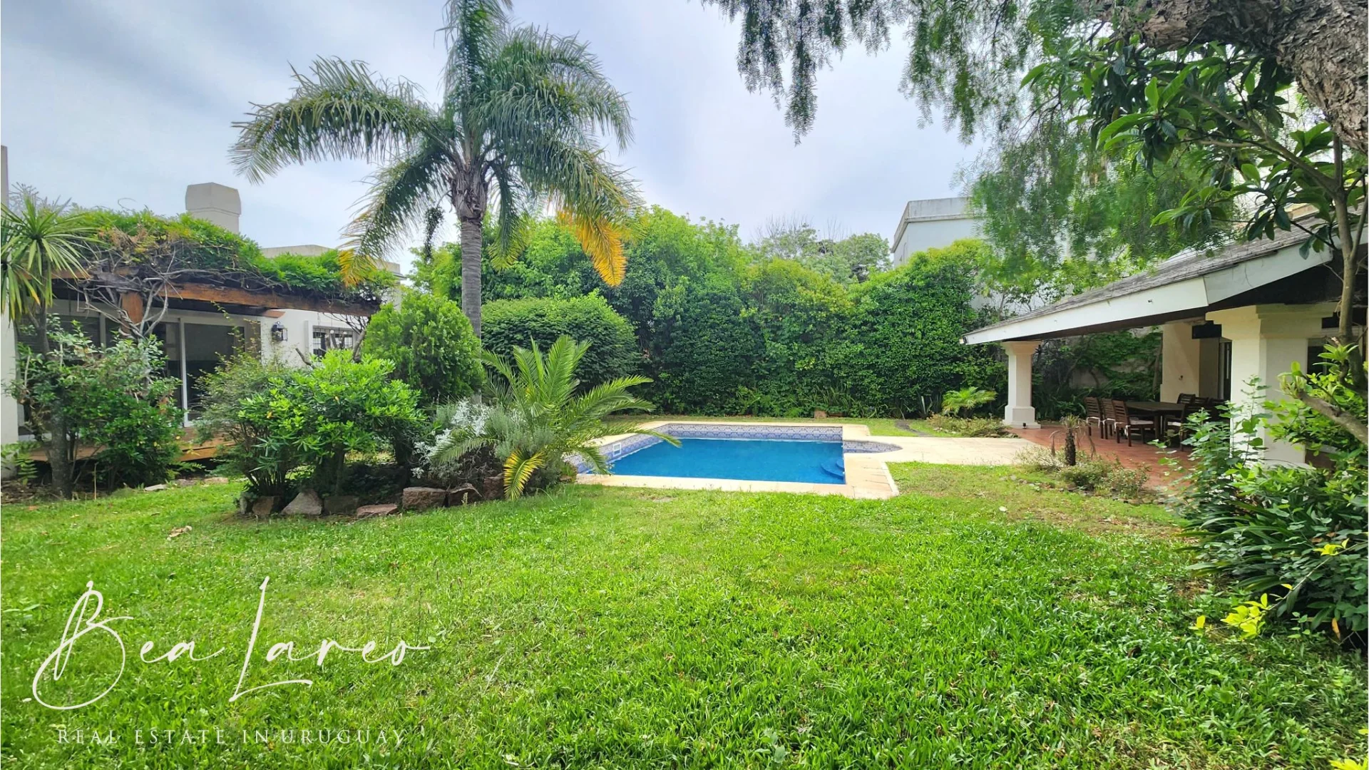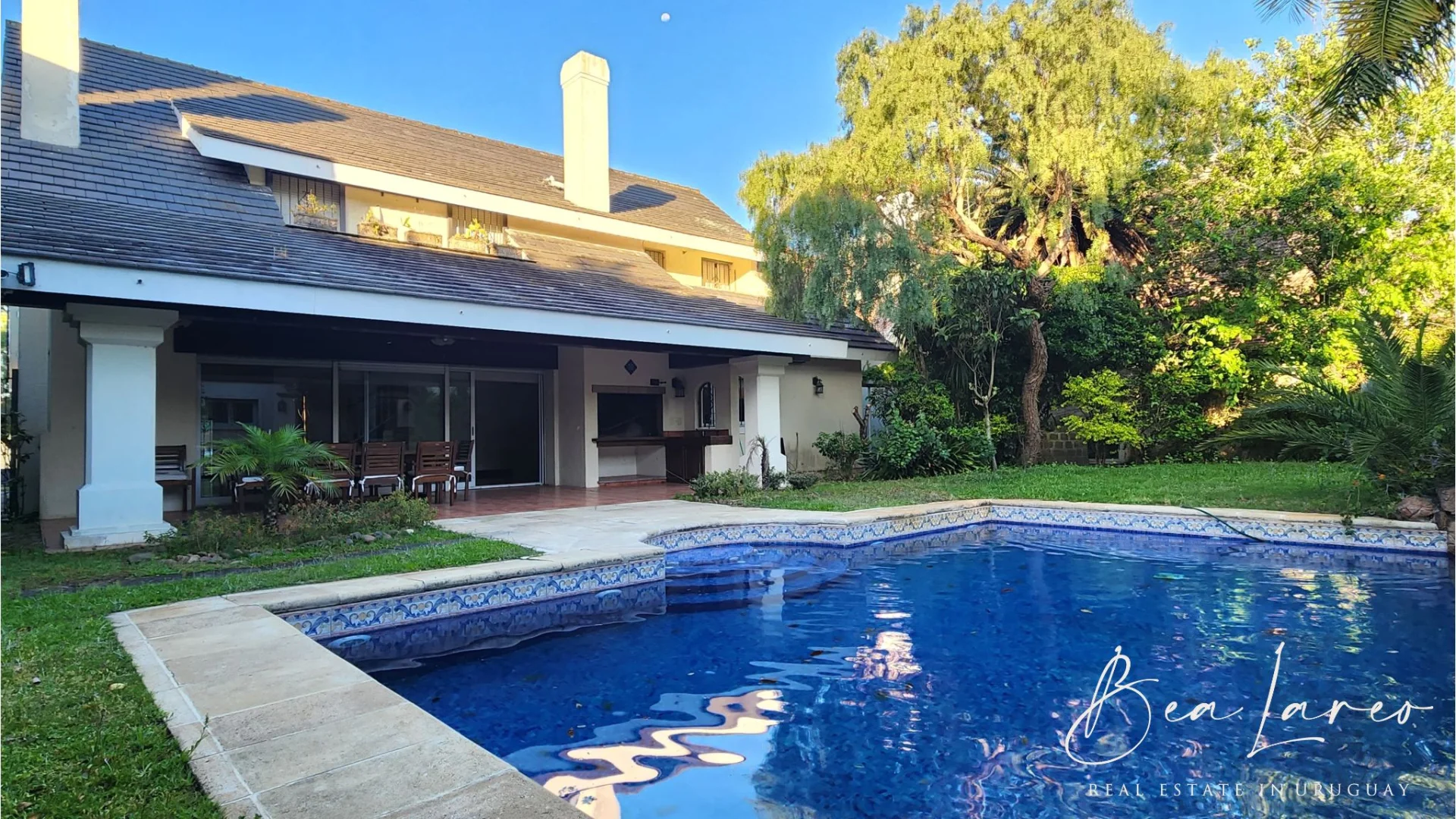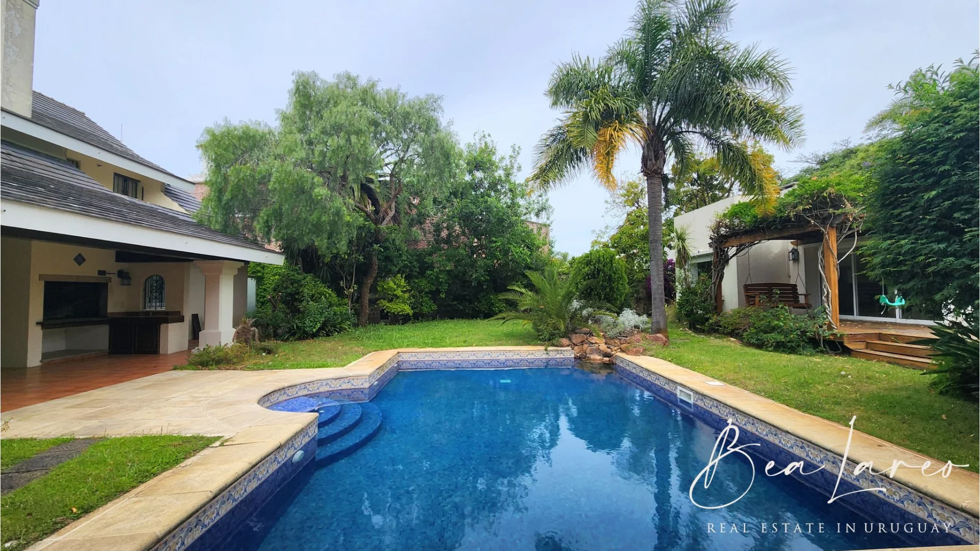 Amplia propiedad en Carrasco sur, próxima a la Rambla. Dispone de 500 m2 construidos en un terreno de 1.223 m2. En planta baja ofrece recepción, amplio living al frente, comedor, estar con estufa a leña vinculado a disfrutable galería con parrillero, cocina reciclada con isla, dormitorio y baño de servicio. En planta alta dispone de 4 amplios dormitorios, dos de ellos en suite (la suite principal con vestidor y baño con jacuzzi ), y dos dormitorios que comparten un baño. Calefacción por losa radiante y aires acondicionados. Gran barbacoa con parrillero y estufa a leña, kitchenette, 1 dormitorio y 1 baño completo (opción escritorio). Apartamento independiente o casa de caseros. Lavadero. Baño exterior. Jardín con gran piscina.