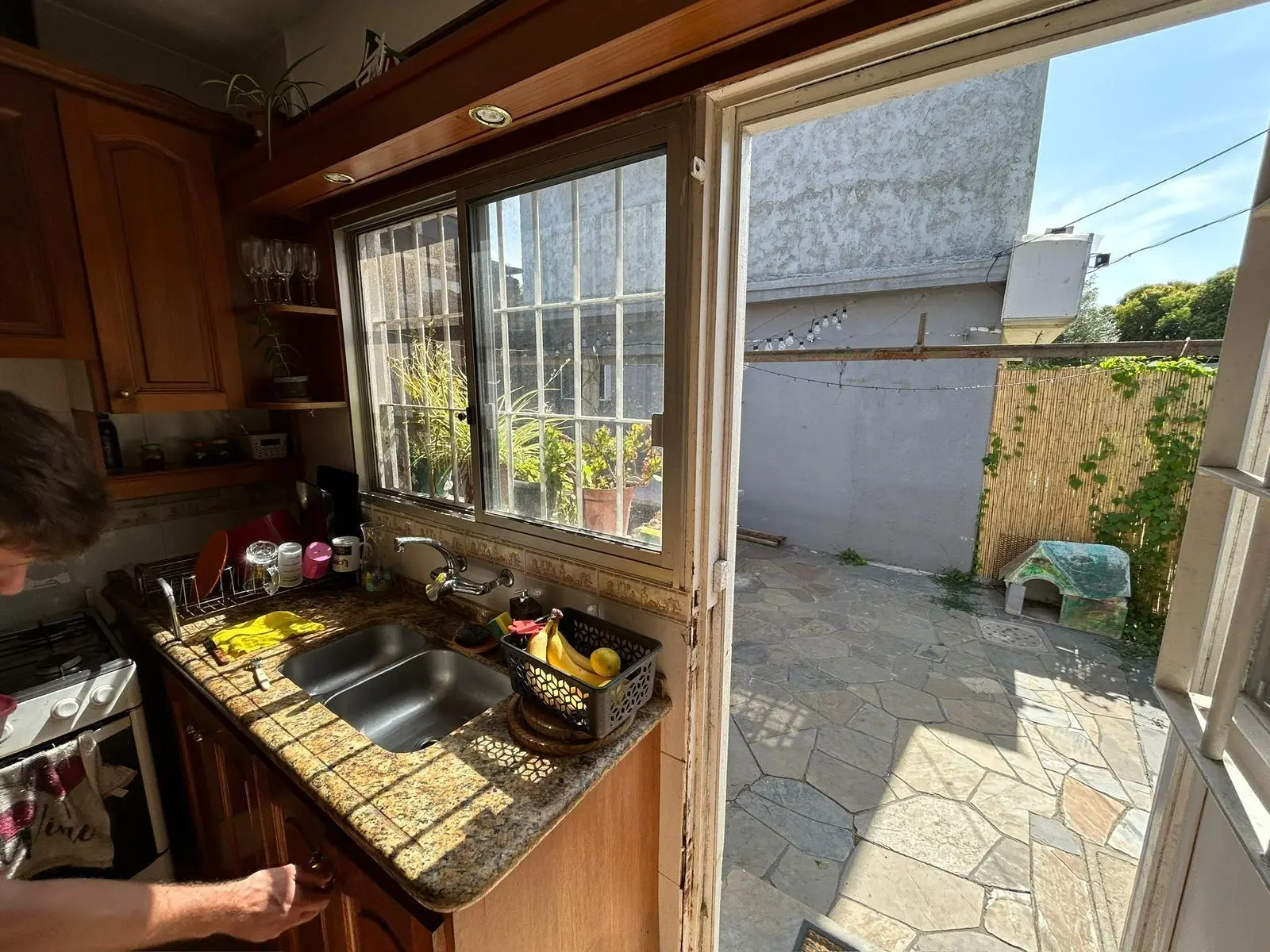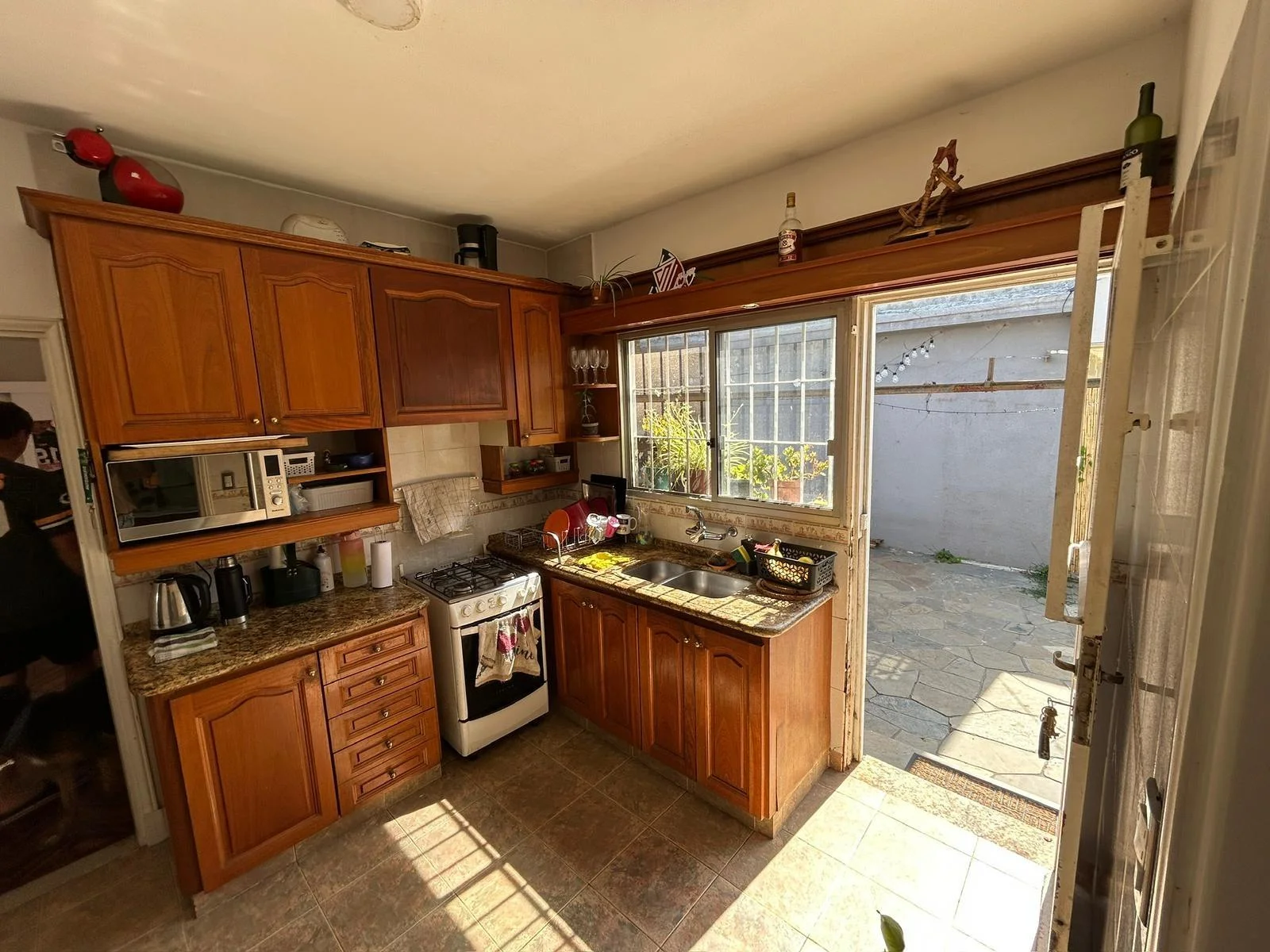Cocina completa, con muebles bajo mesada y aéreos en madera. Ventana con puerta en la cocina que dan para el fondo.