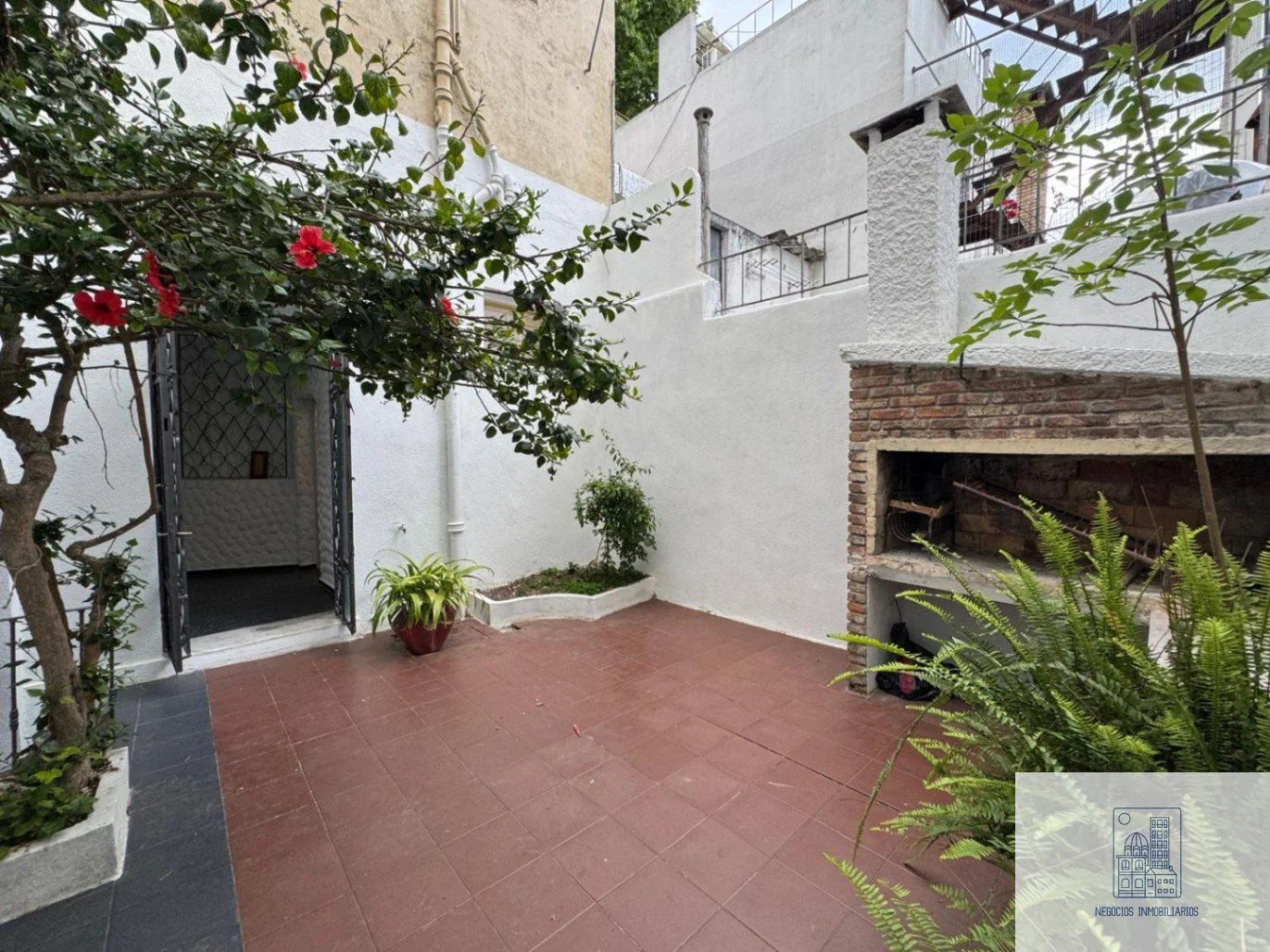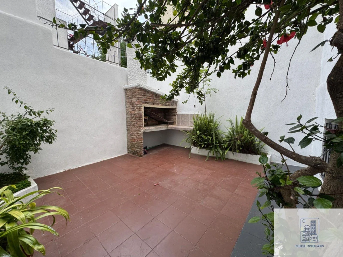 • Hermoso patio rodeado de plantas y parrillero.