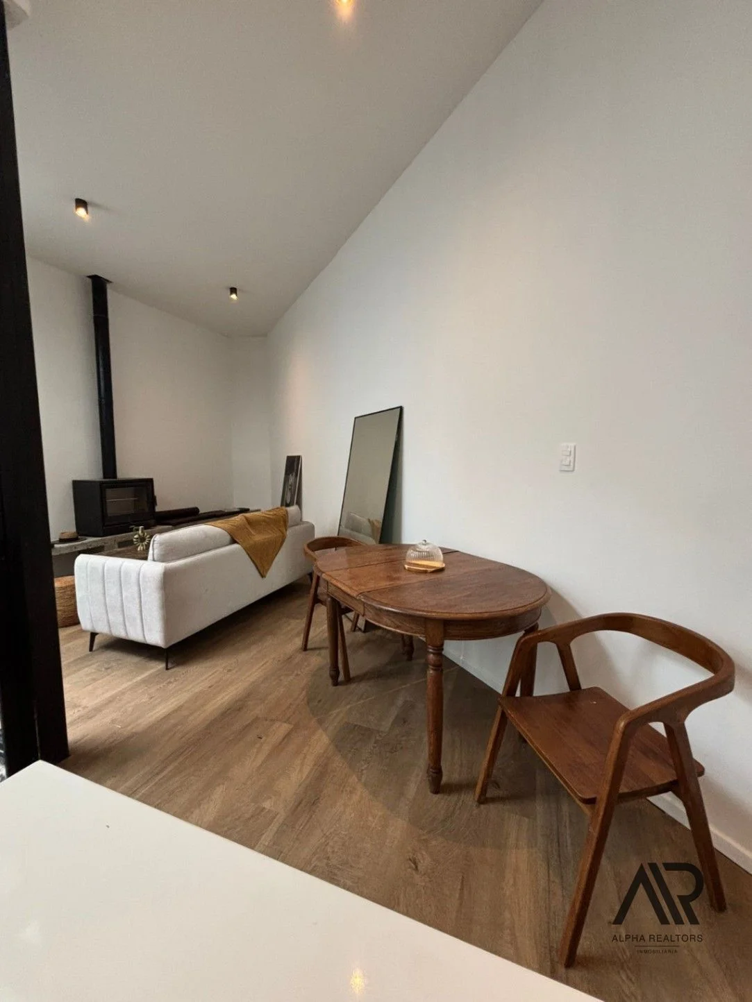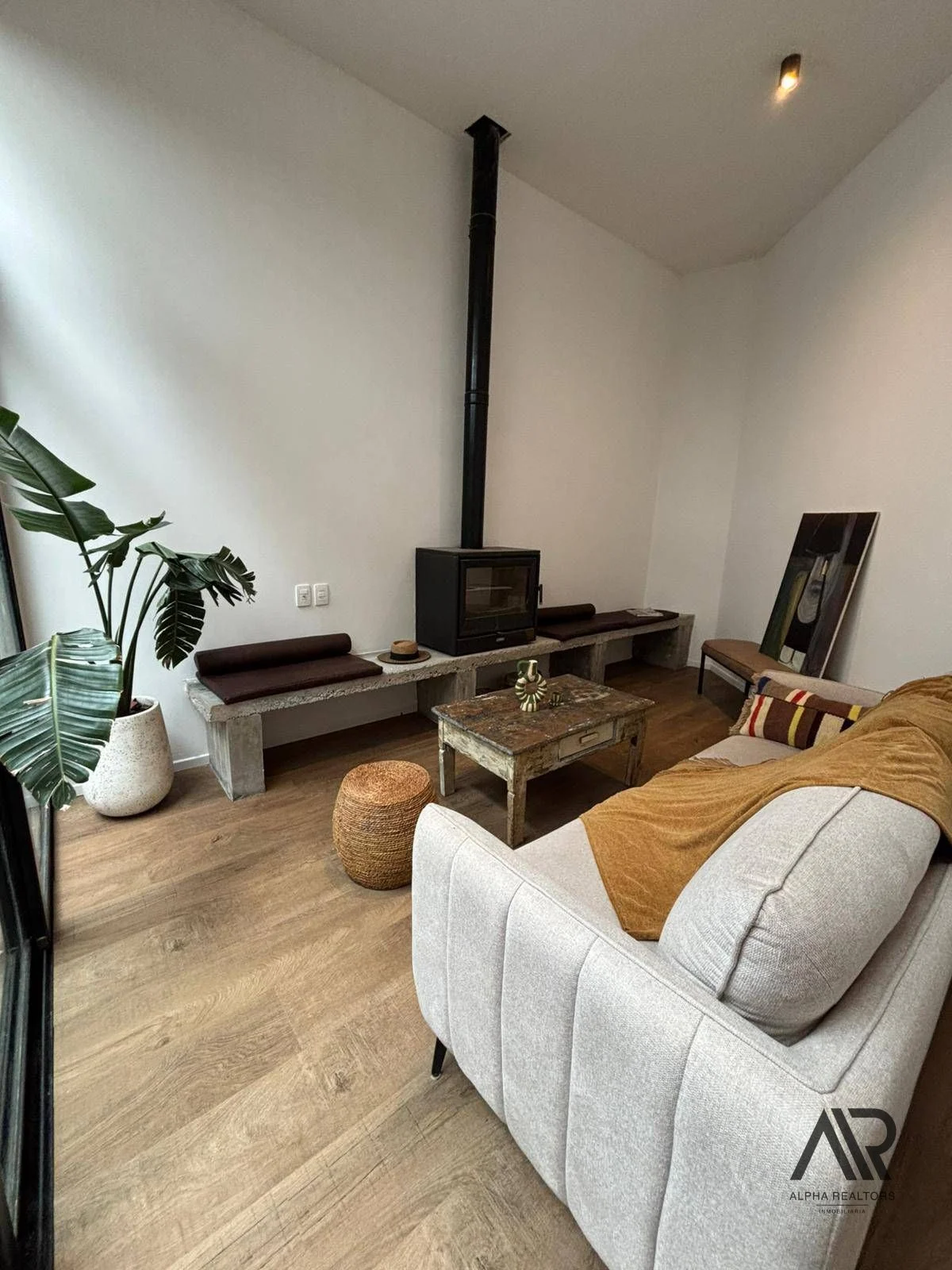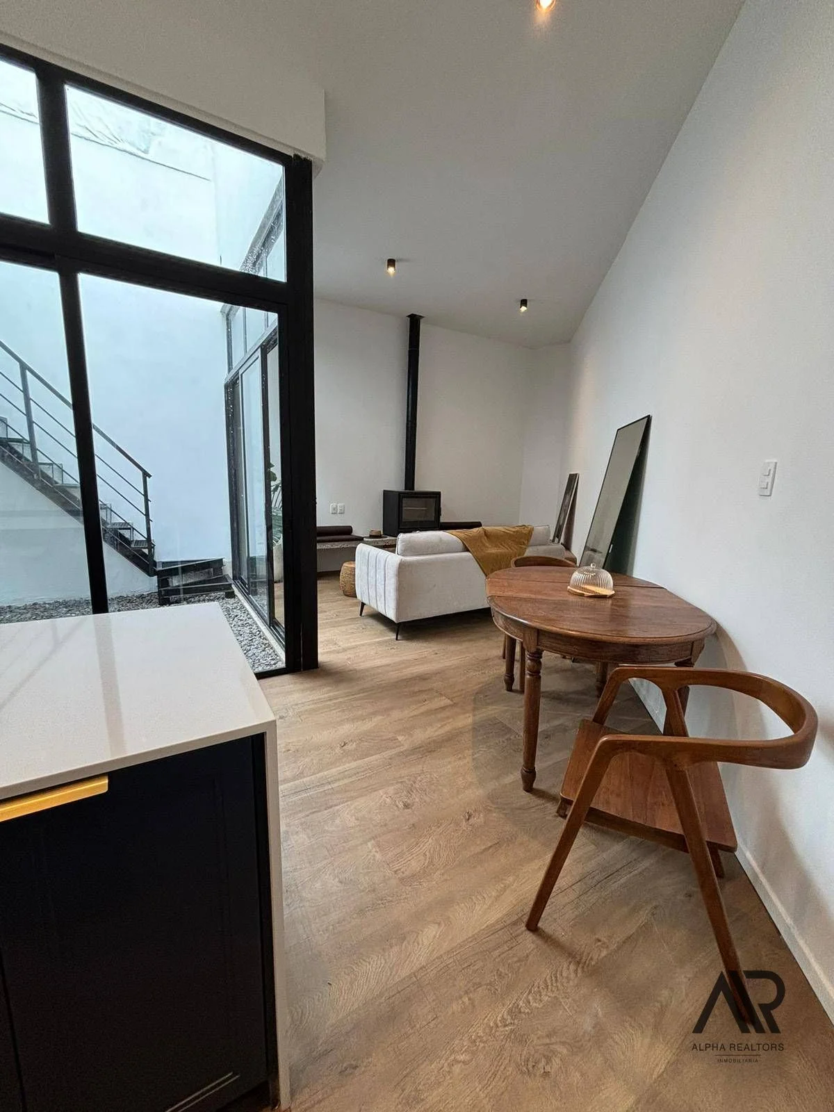 El living y comedor integrados cuentan con acceso al patio, donde destacan un banco de cemento y una estufa de alto rendimiento, perfectos para disfrutar en cualquier estación.