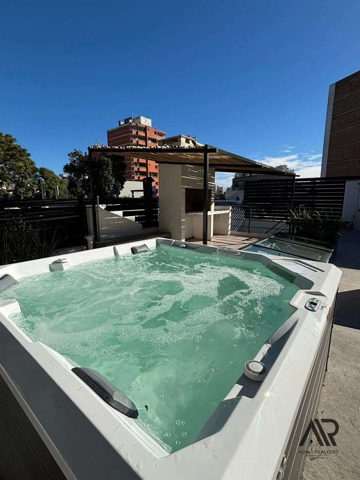 Desde el patio se accede a la azotea transitable, equipada con un gran tender, parrillero con bacha, pérgola y un hidromasaje con capacidad para ocho personas.