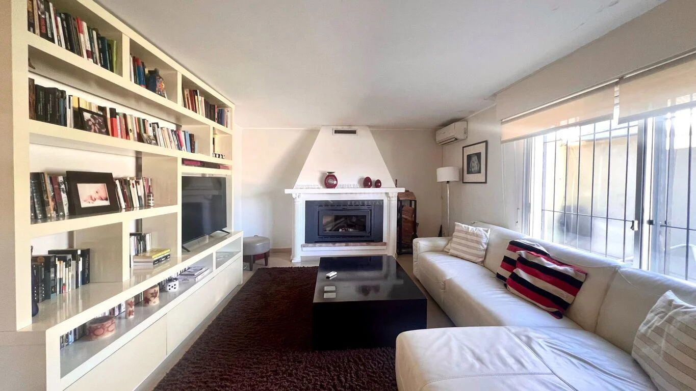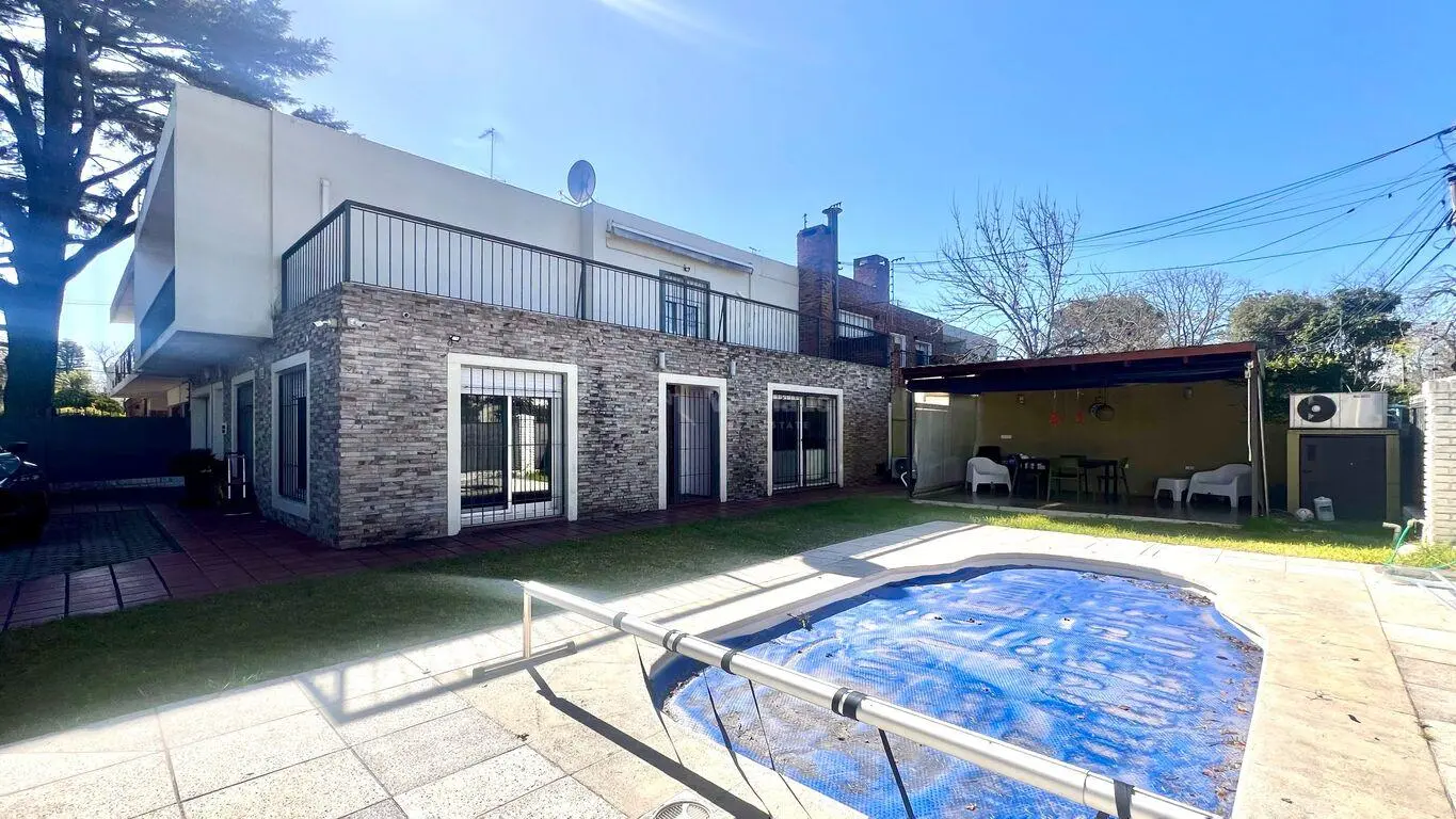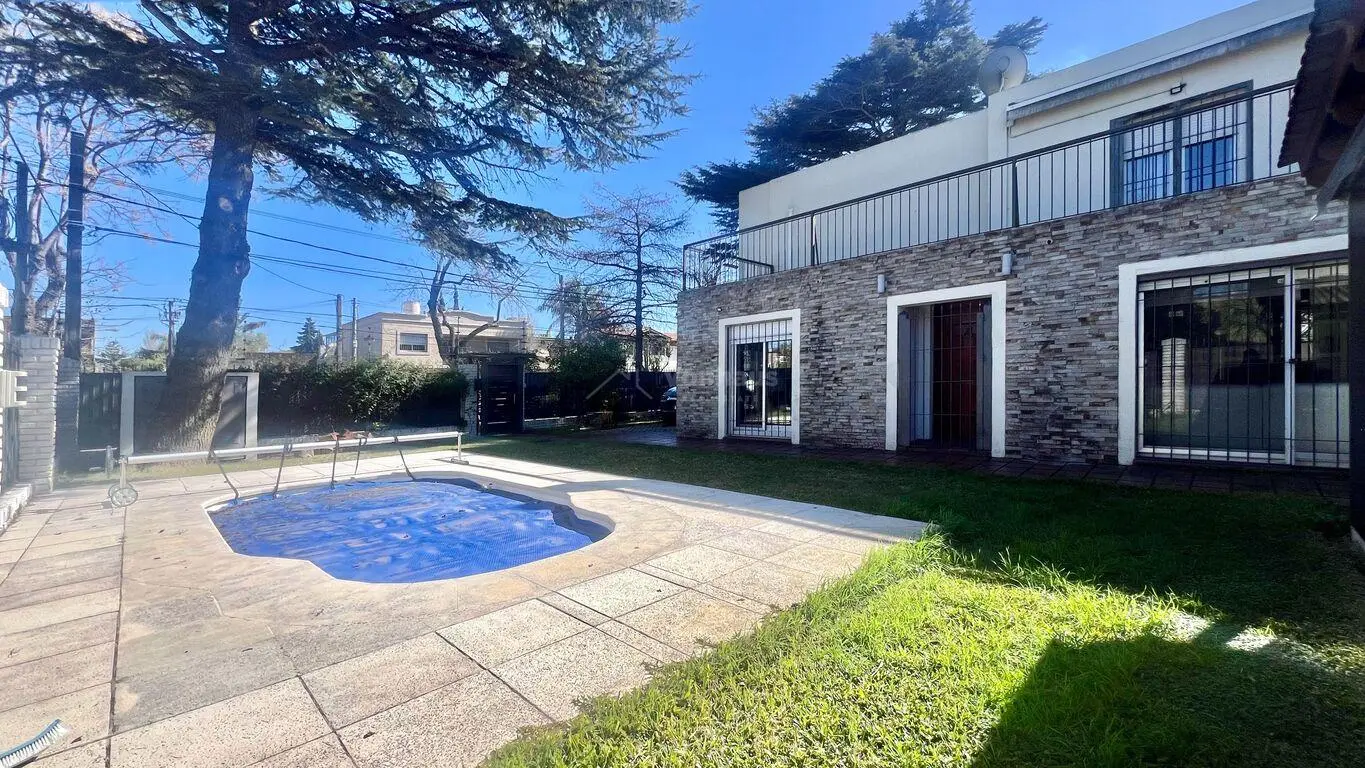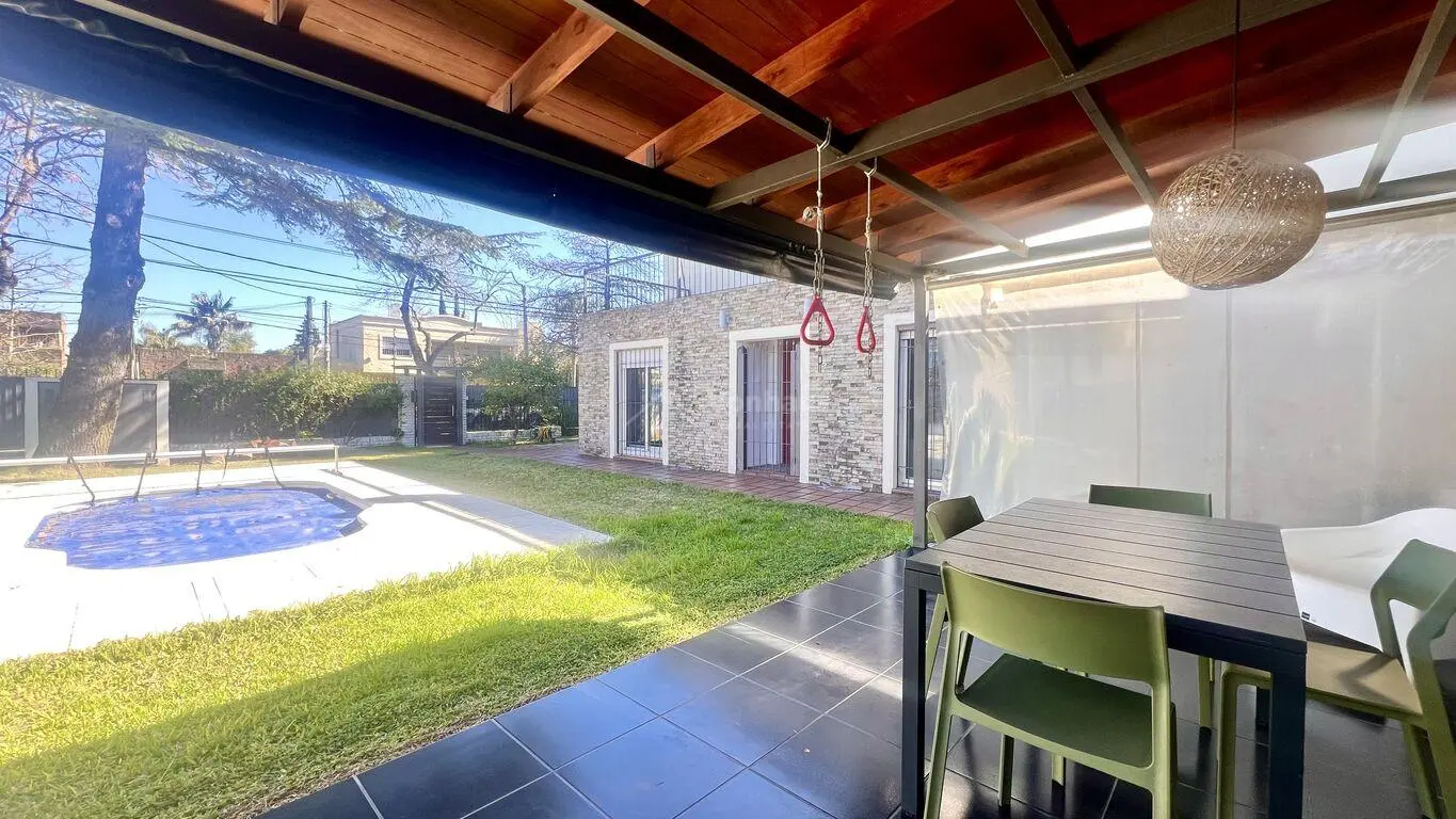 Por otro lado cuenta con Jardín en forma de L, con piscina, parrillero y estar exterior con cerramientos ponti y garaje cerrado para un auto, amplio con cortina motorizada y acceso directo interior a la casa. Cochera abierta para segundo auto.