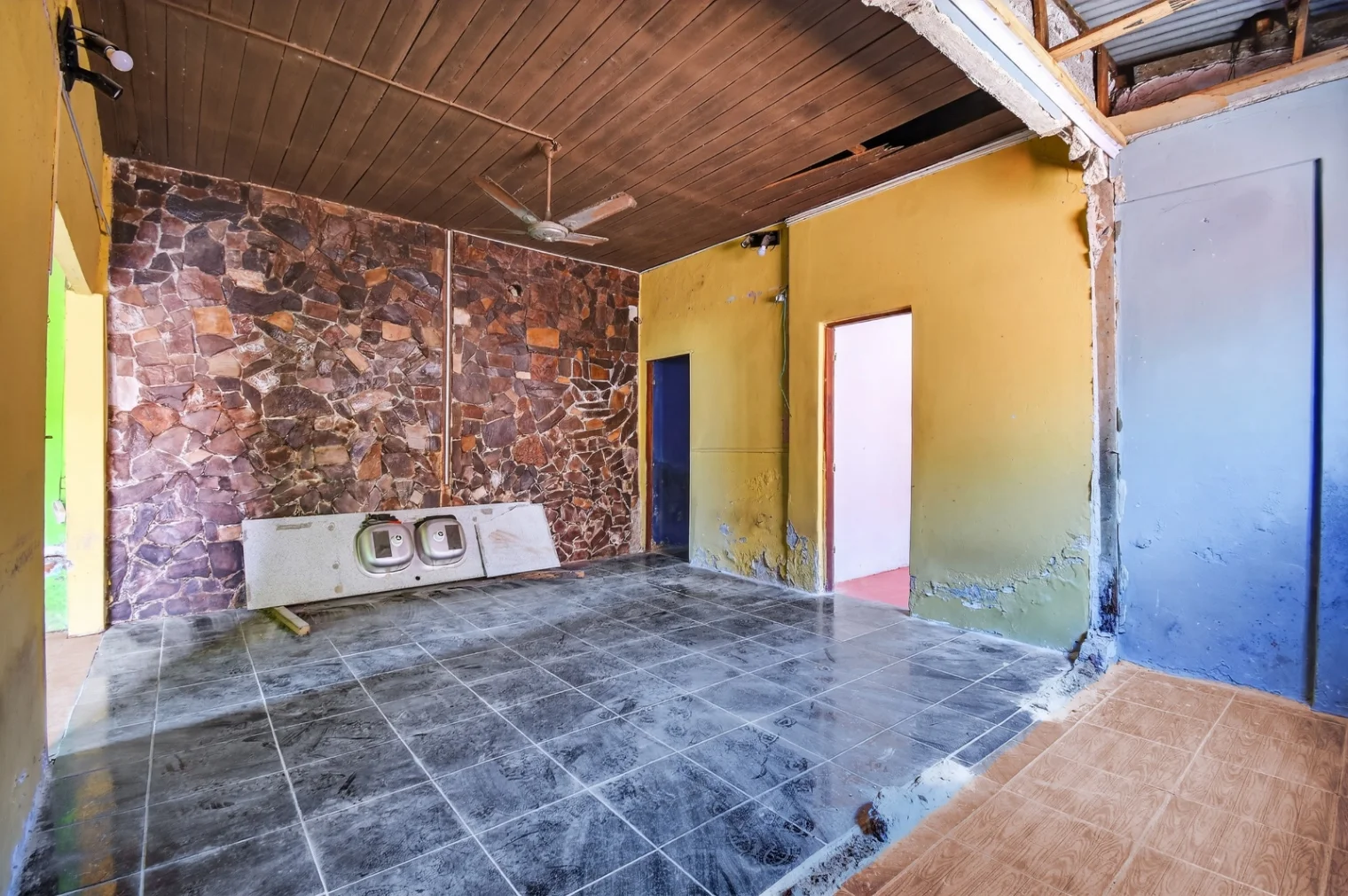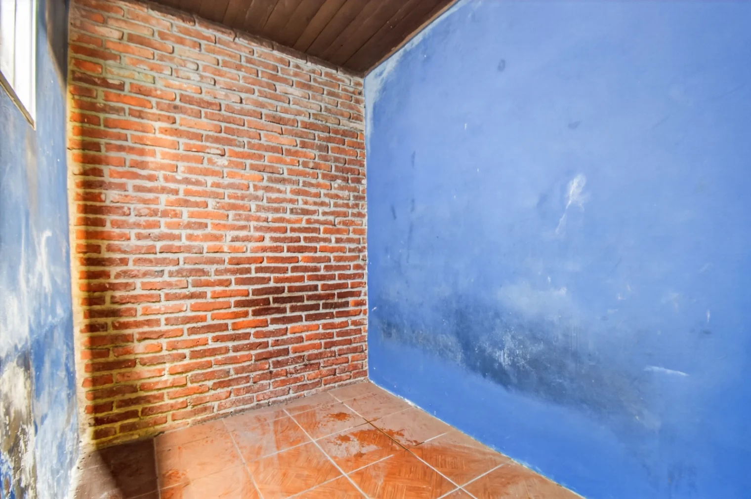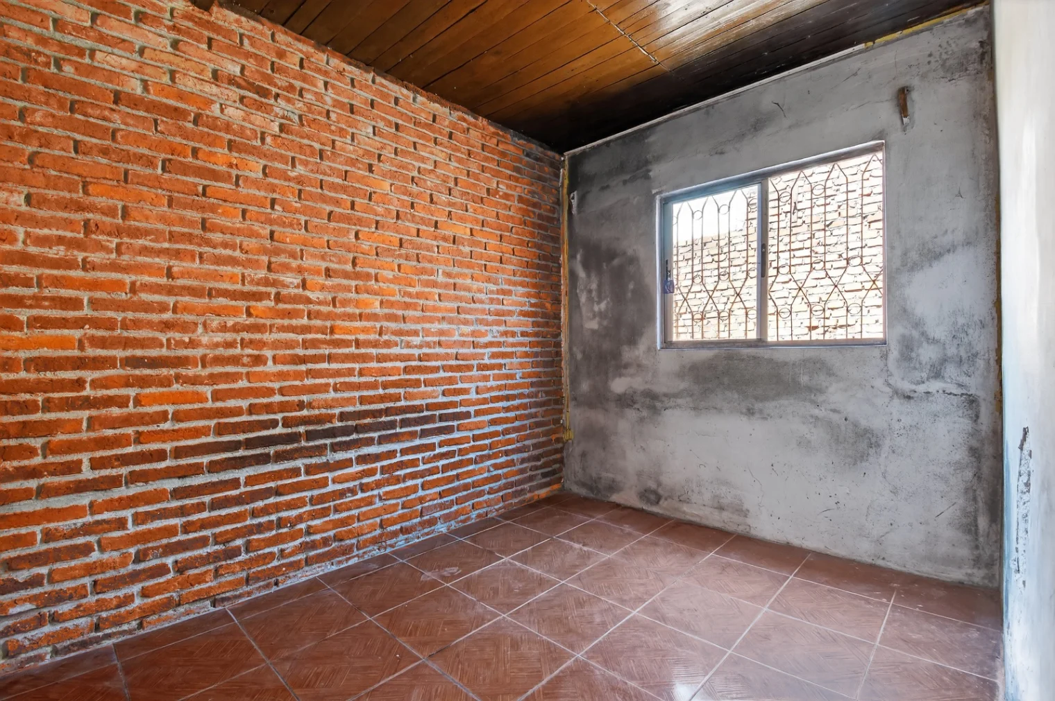 Construcción tradicional en muro de bloque de hormigón y ladrillo, con techo liviano de chapa y cielorraso.