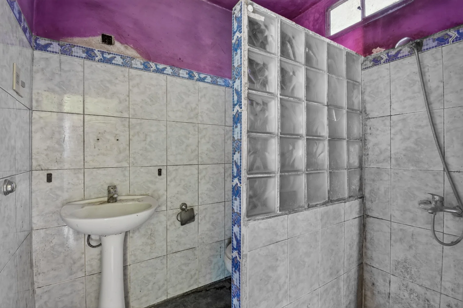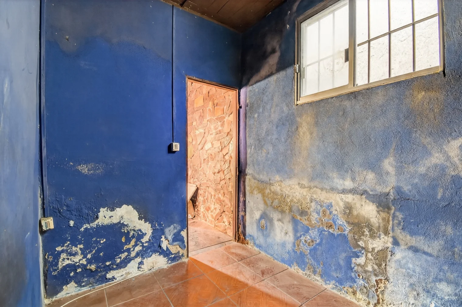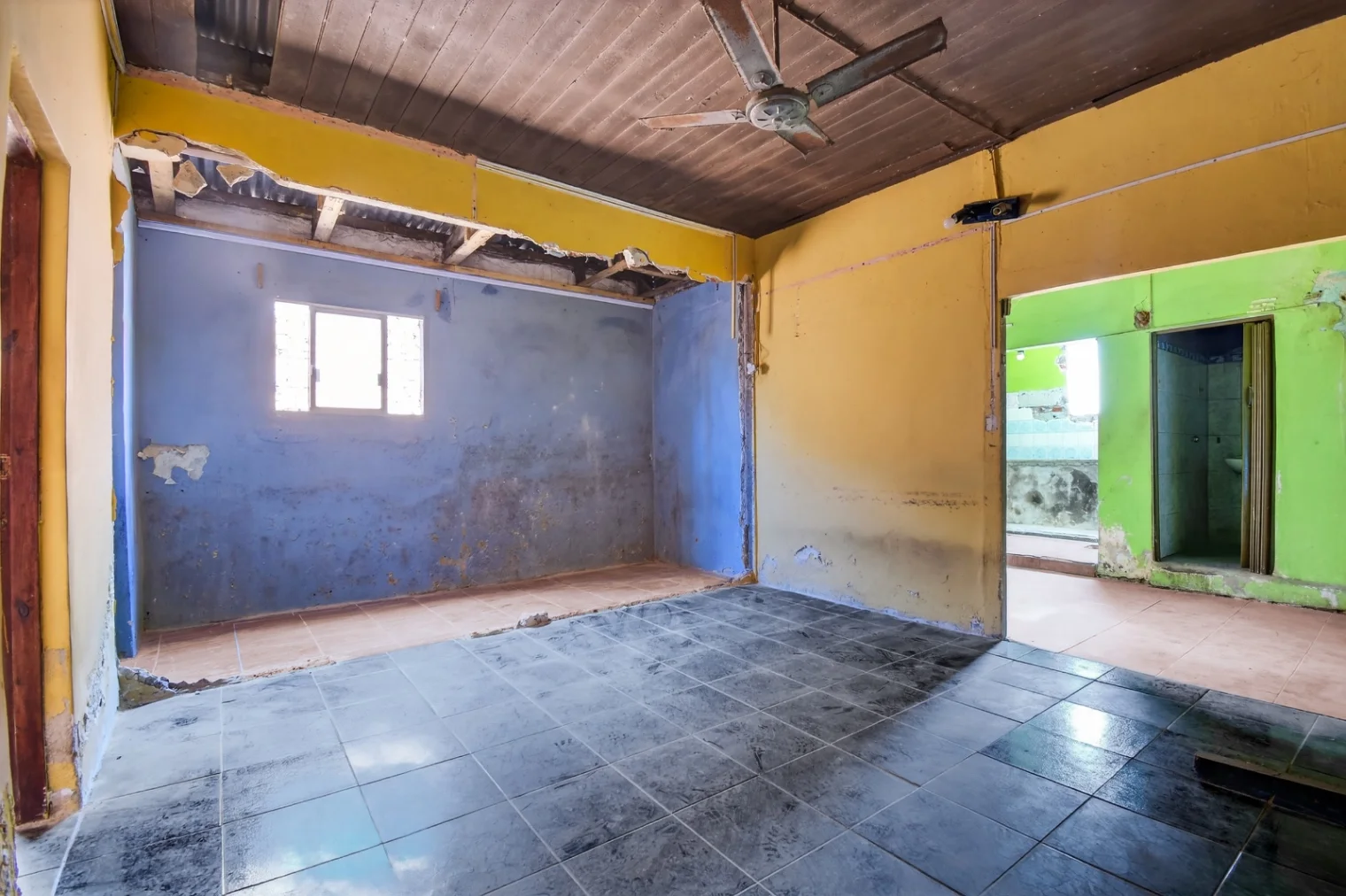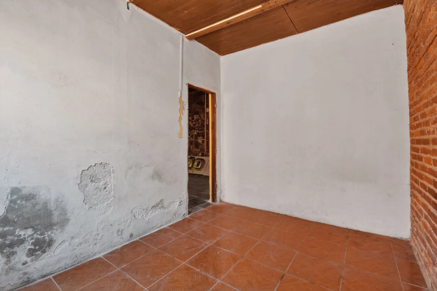 Construcción tradicional en muro de bloque de hormigón y ladrillo, con techo liviano de chapa y cielorraso.